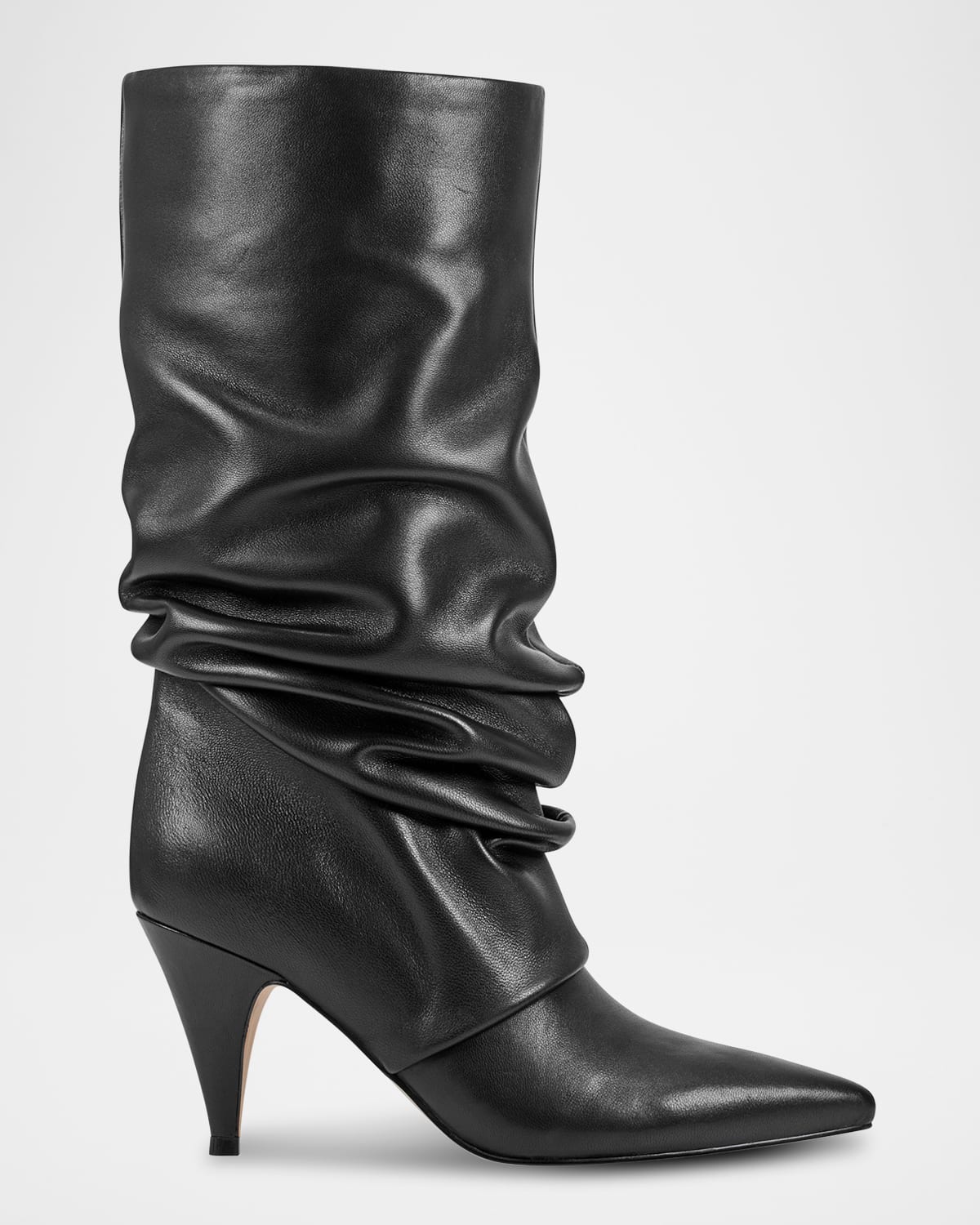 Marc Fisher LTD retroinspired slouchy leather mid boots 2.75 in / 70 mm kitten heel Boot shaft, approx. 10.9"H Pointed toe Pullon style Manmade outsole Manmade outsole Lining: Synthetic Spot clean Imported