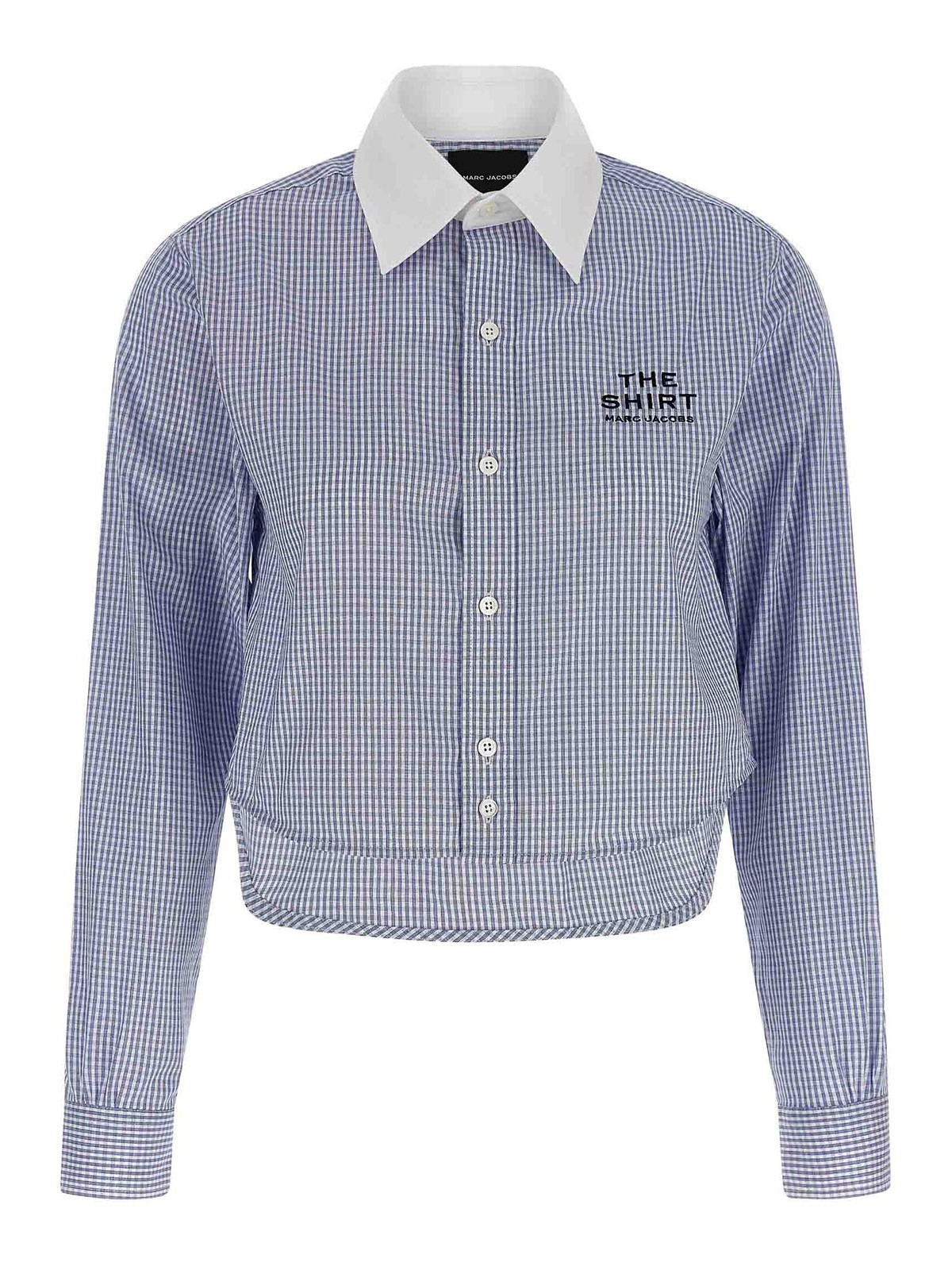 chemise courte pour femme en popeline à carreaux avec col contrastant, style court, logo, bouton, manches longues à revers