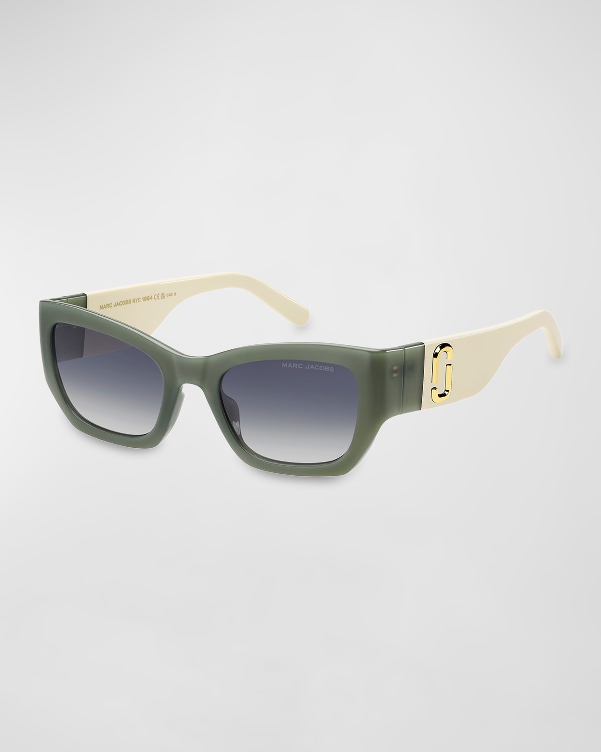 Marc Jacobs "Marc 723S" cateye sunglasses in propionate Lens/bridge/temple (in mm): 5321135 Gradient lenses; logo on corner Saddle nose bridge Logo on temples Wide, tapered arms Wipe clean 100% UVA/UVB protection Imported