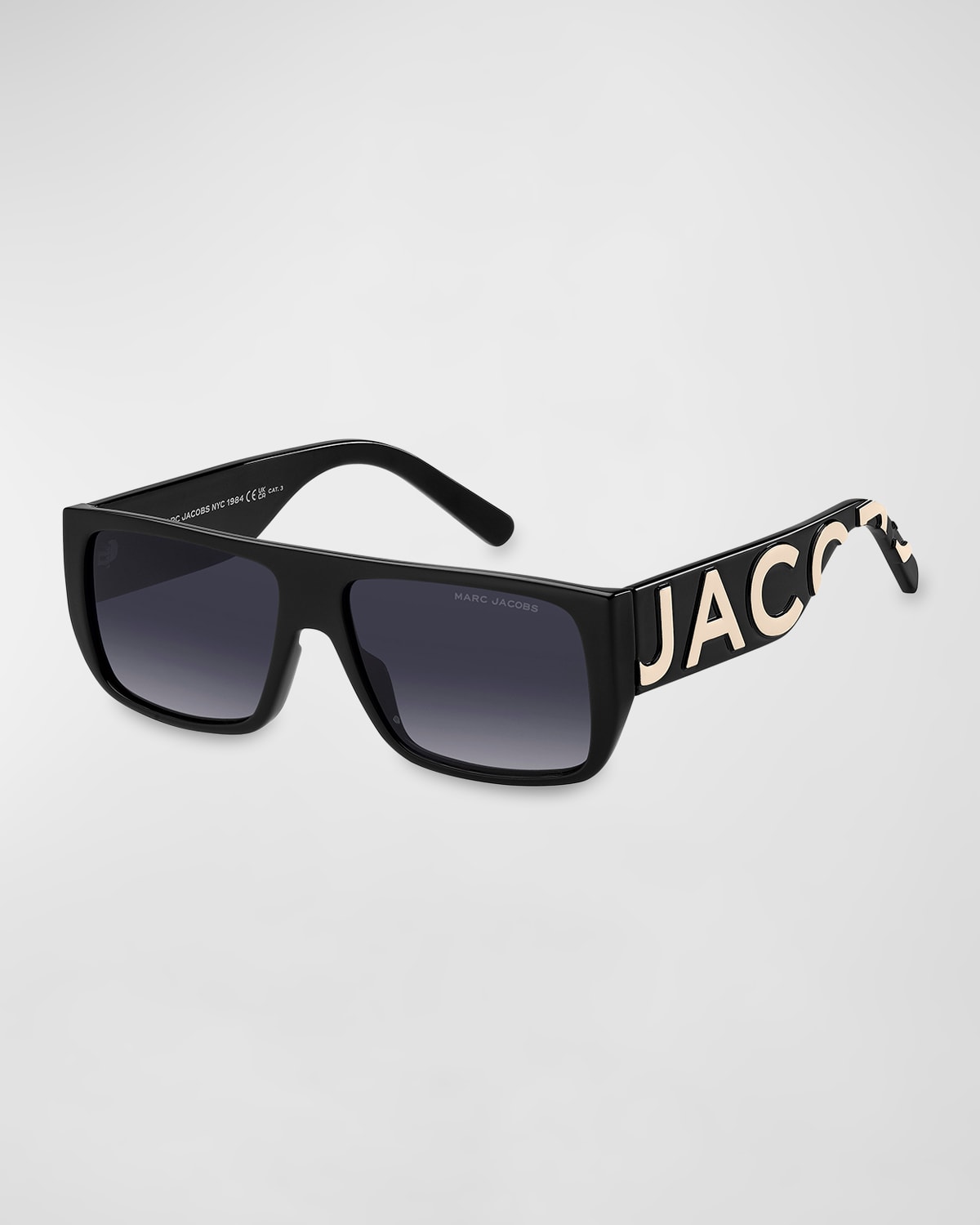 Marc Jacobs "Marc Logo 096S" flattop rectangle sunglasses in propionate Lens/bridge/temple (in mm): 5715145 Gradient lenses; logo on corner Saddle nose bridge Wide, tapered arms; embossed logo Wipe clean 100% UVA/UVB protection Imported