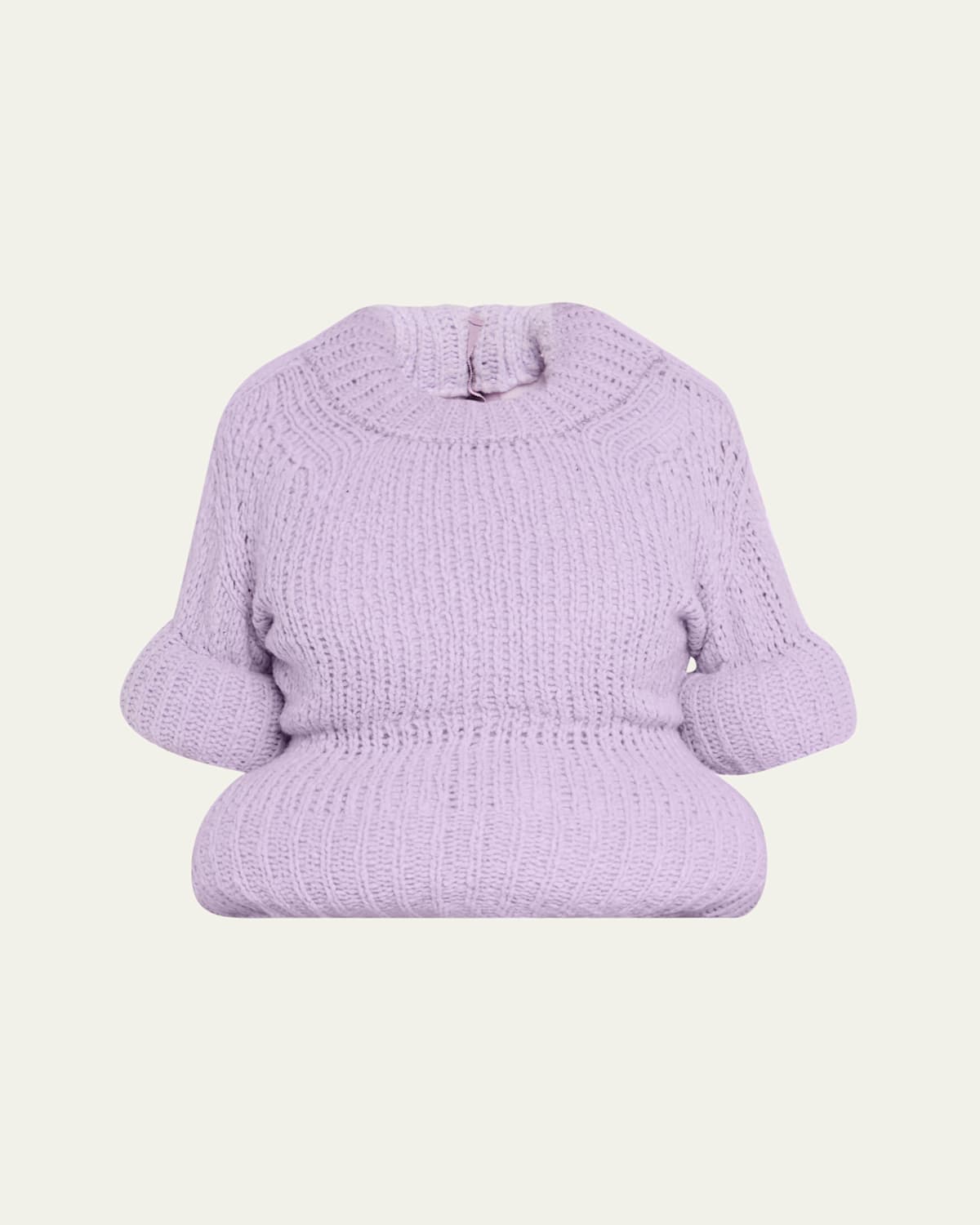 Knit with sculptural charm, this Marc Jacobs Runway sweater is handspun in an English rib featuring a padded peplum bodice and cuffs for a voluminous and bold silhouette, transforming cozy texture into highfashion drama. Crew neckline Short sleeves Fitandflare silhouette Hip length Back zip Wool/nylon/polyamide/polyurethane Made in USA from imported materials