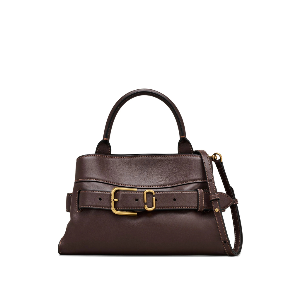 dark brown top handle adjustable shoulder strap gold-tone hardware buckle detail top zip fastening