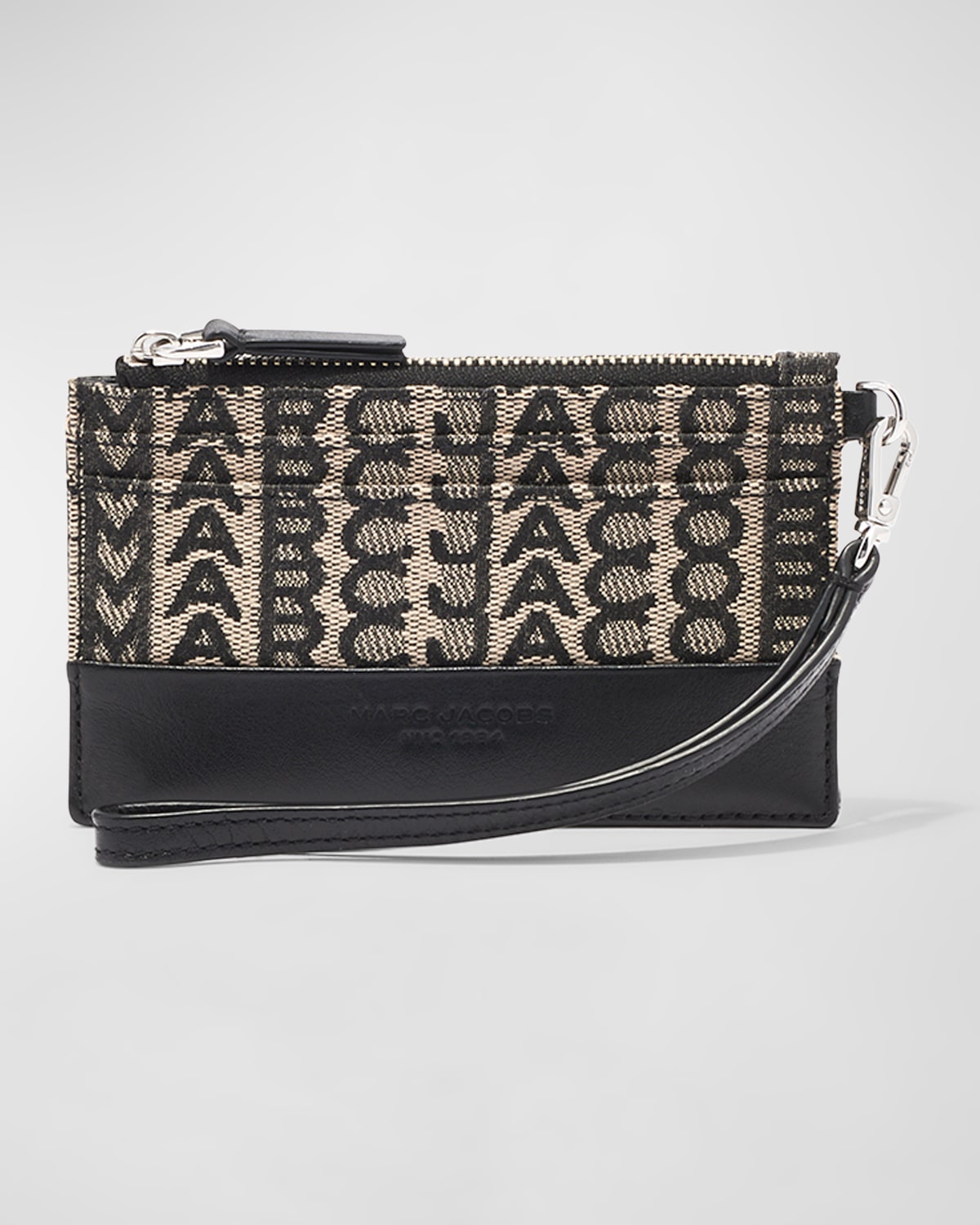 Marc Jacobs wristlet in monogram fabric and faux leather (polyurethane) Detachable wristlet strap Zip top closure Exterior, six card slots and one slip pocket Interior, chain key ring Approx. 3.2"H x 5.3"W x 0.6"D Imported