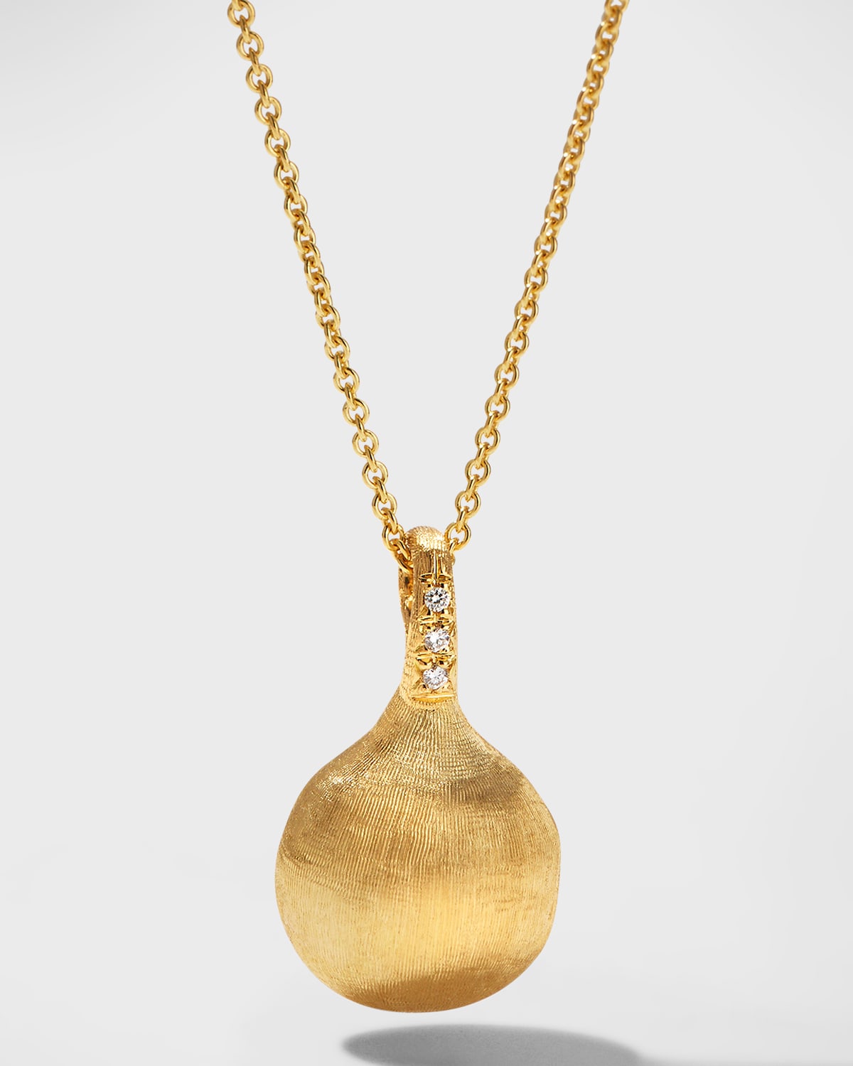 Marco Bicego necklace from the Africa Collection. Handengraved 18karat yellow gold hardware. Rounded pendant with diamonds at bale. 0.03 total diamond carat weight. Approx. 15.25"L. Handcrafted in Italy.