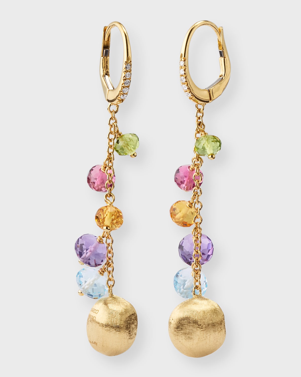 Marco Bicego earrings Handengraved 18karat yellow gold Huggie hoops with white diamonds Faceted multicolor gemstones as dangles Professional cleaning recommended Diamond total carat weight: 0.07 For pierced ears Made in Italy