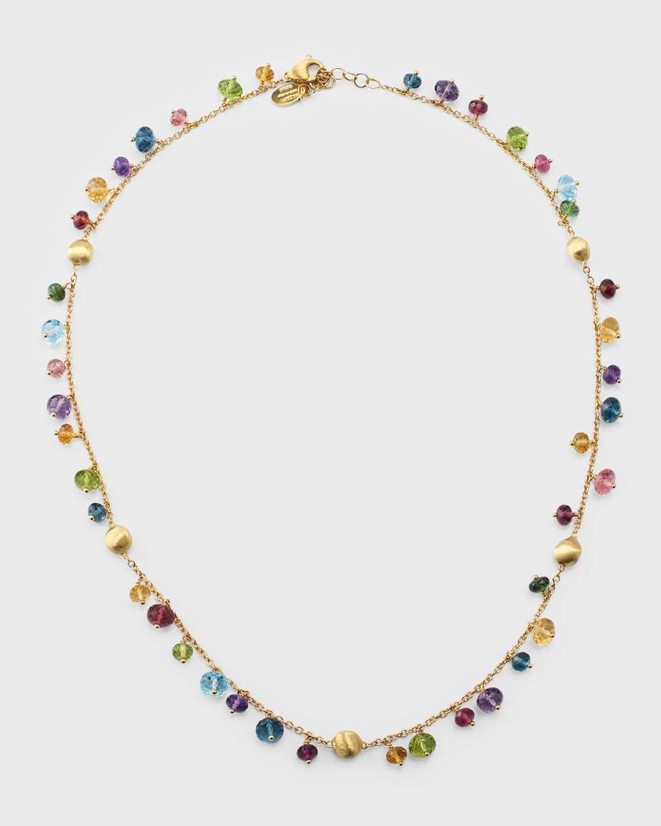 Marco Bicego necklace Approx. 16.5" length Handengraved 18karat yellow gold Faceted multicolor gemstones as dangles Professional cleaning recommended Adjustable length Lobster clasp Made in Italy