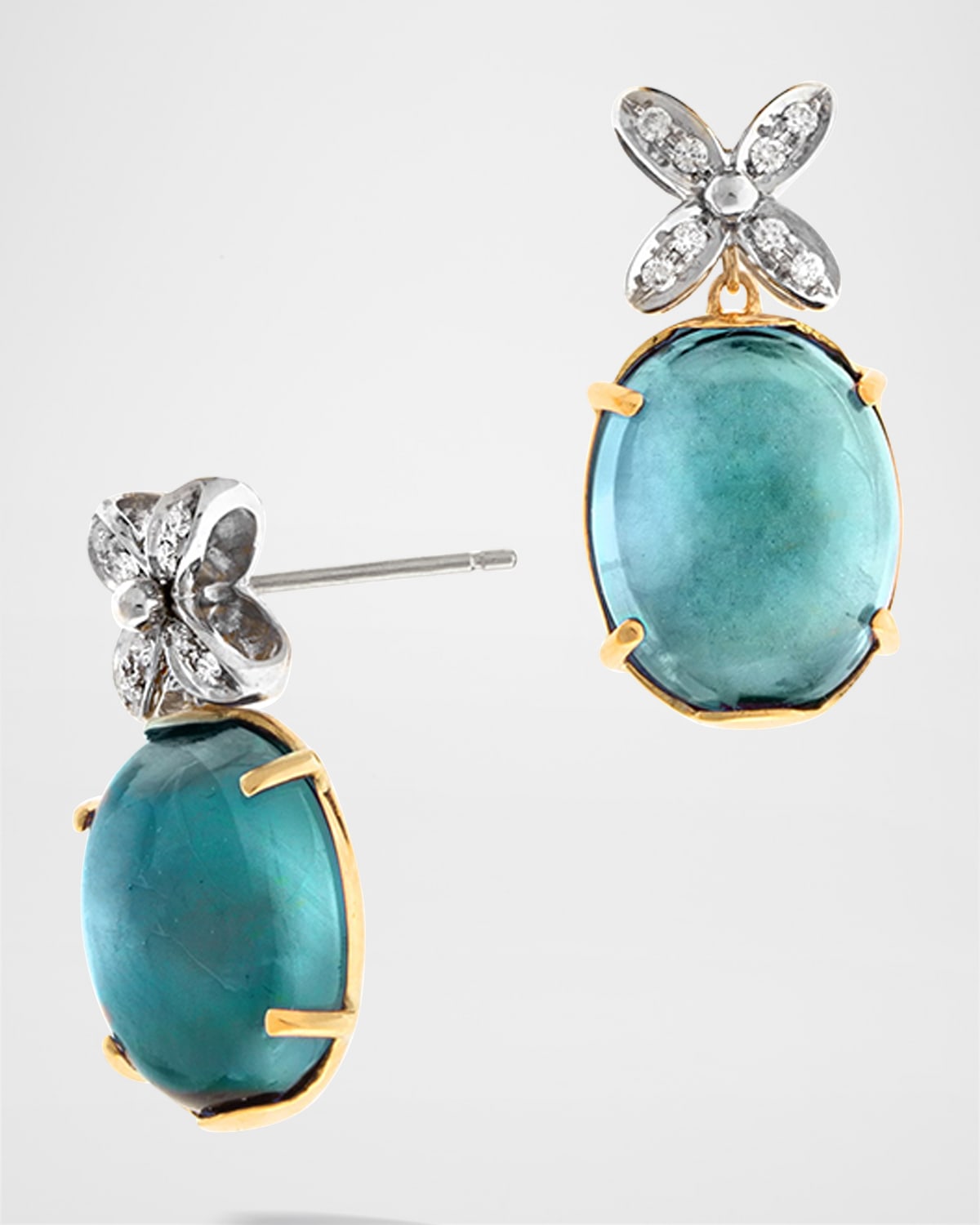 Marco Bicego drop earrings Approx. 1.05" drop Handengraved 18karat yellow gold Faceted blue semiprecious stones Diamond carat weight: 0.12 For pierced ears Made in Italy