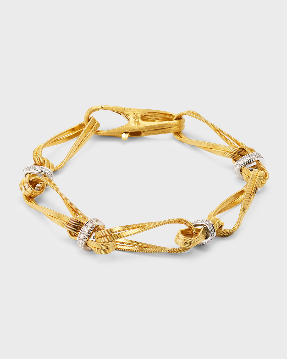 Marco Bicego bracelet from the Marrakech collection Bracelet length: approx. 8.5 inches Handcoiled 18karat yellow gold Diamonds set in 18karat white gold 0.85 total diamond carat weight Lobster clasp Made in Italy