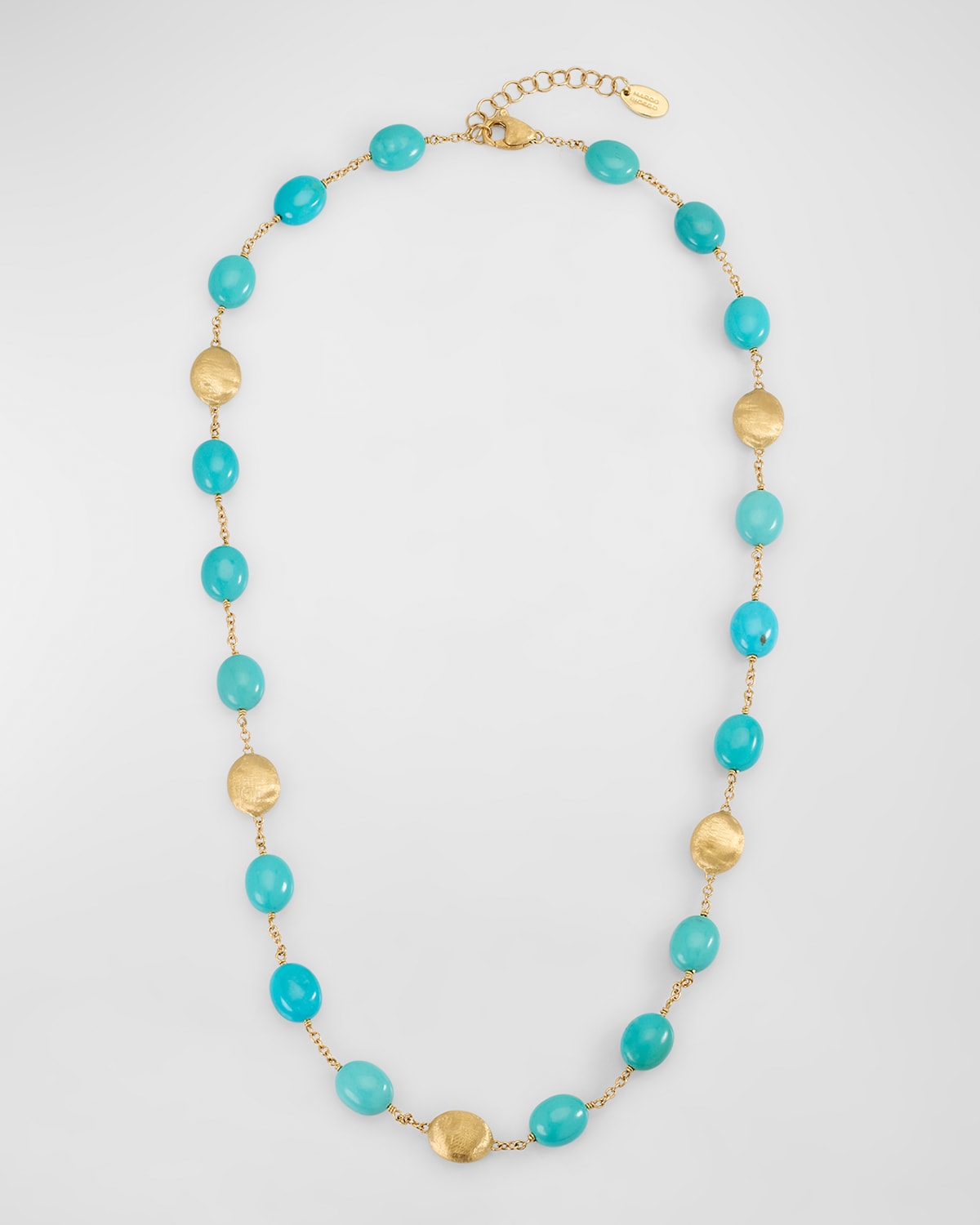 Marco Bicego necklace Approx. 16.5" length Handengraved 18karat yellow gold Ovalshaped turquoise cabochons Professional cleaning recommended Adjustable length Lobster clasp Made in Italy