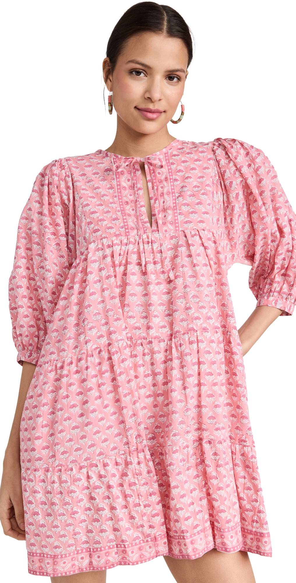 Fabric: Lightweight non-stretch weave. Tie keyhole at round neckline. Pleated 3/4 length sleeves. Tiered pleated skirt. Floral print. On-seam hip pockets. Shell: 100% cotton. Hand wash. Imported, India. Measurements: Measurements from size S Length: 32.75in / 83.0cm, from shoulder