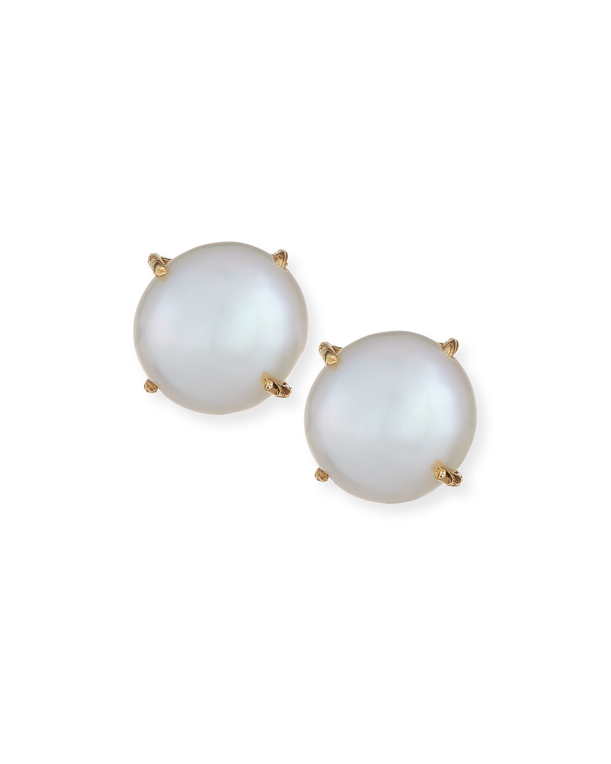 Pearl stud earrings by Margo Morrison. Polished 14karat yellow gold hardware. Dyed freshwater cultured pearl centers. Post backs for pierced ears. Approx. 0.6" round (15mm). Made in USA.