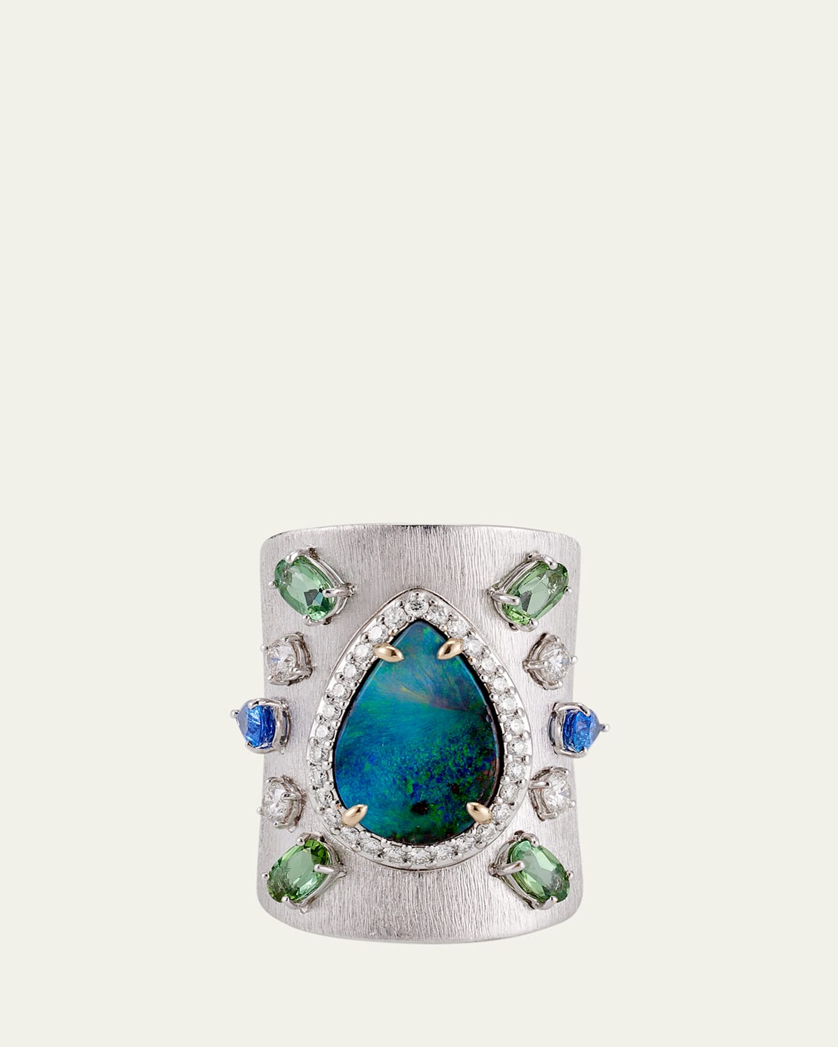 Margot McKinney Jewelry ring Brushed 18karat white gold Green tourmaline, blue sapphire, and cabochon opal White diamond pavé and side stones 0.68 total diamond carat weight Made in Australia