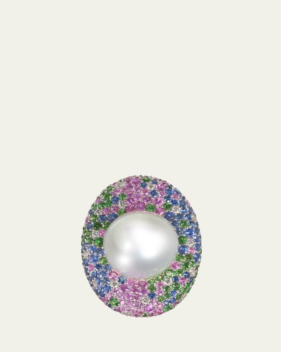 Margot McKinney Jewelry cocktail ring 18karat white gold Naturallyhued South Sea cultured pearl center Roundcut blue sapphires, pink sapphires, and tsavorites Roundcut white diamonds 2.89 total blue sapphire carat weight 2.76 total pink sapphire carat weight 2.33 total tsavorite carat weight 0.4 total diamond carat weight Made in Australia