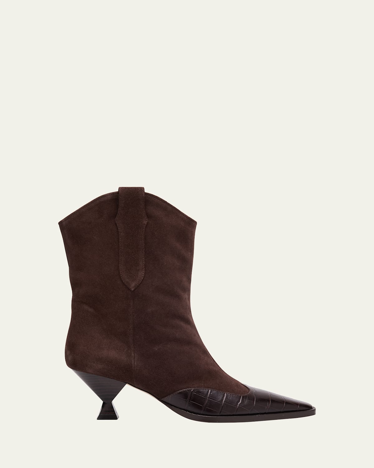 Maria Luca "Nila" suede western ankle boots with crocoembossed leather wingtip toe 2.50 in / 65 mm architectural heel Square toe Pulltab collar Slipon style Leather outsole Lining: Leather Made in Italy