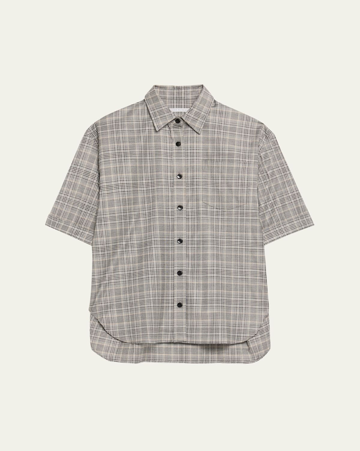 MARIA MCMANUS woven plaid shirt is tailored with a stepped hem Approx. 21"L from shoulder to hem Point collar; button front Short sleeves Chest patch pocket Stepped hem Oversized fit Button closure Wool/viscose/elastane Dry clean Made in Portugal