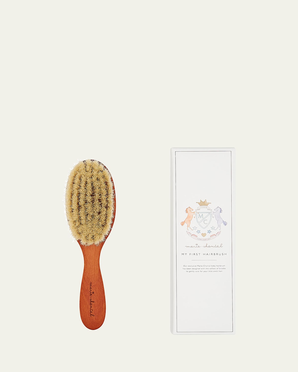 Marie Chantal "Aristidis" baby hairbrush with crest engraved back Our exclusive mariechantal baby hairbrush has been designed with the softest of bristles to gently care for your little one's hair. Comes in gift box Made in Germany