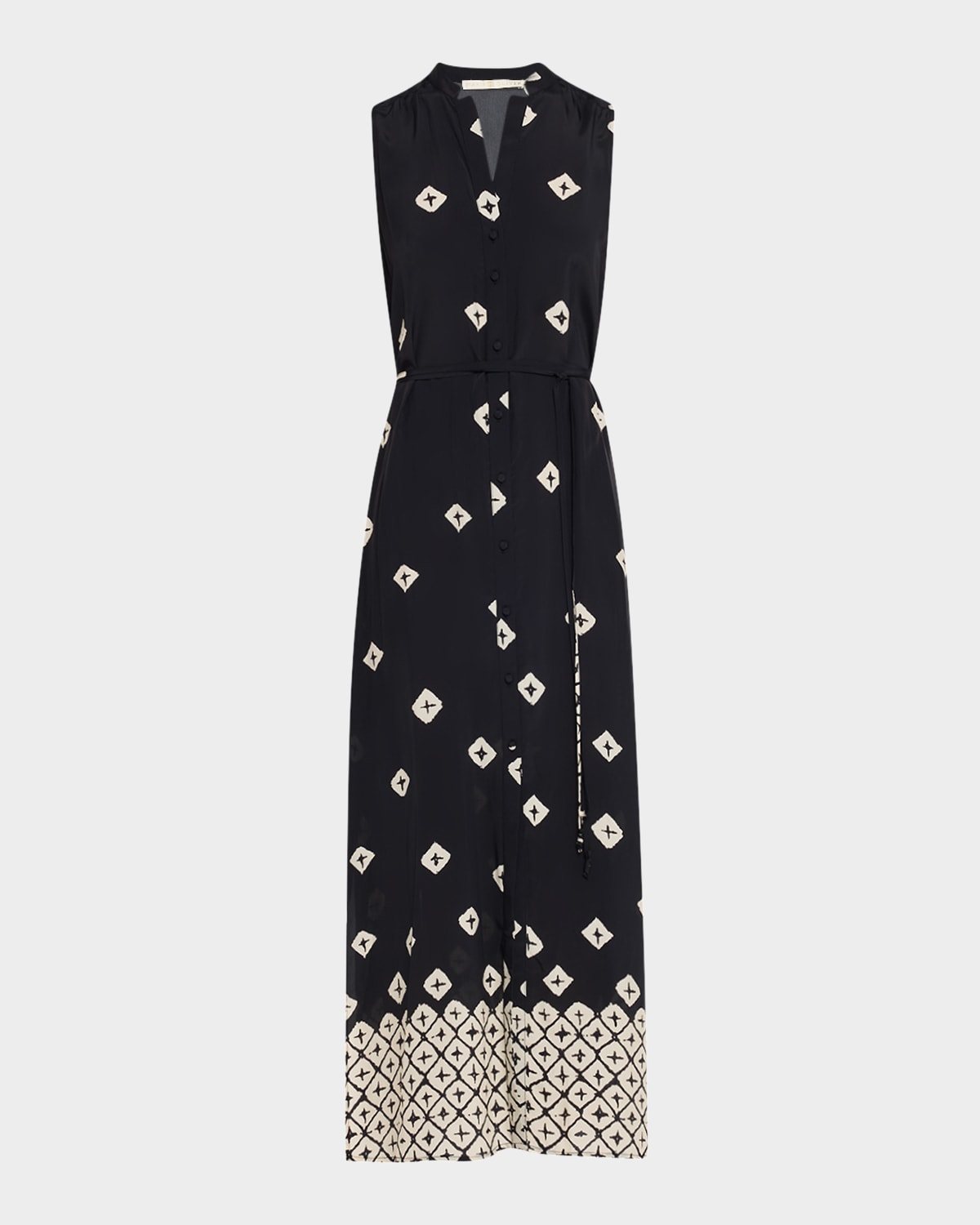 Marie Oliver "Kirkley" dress illustrated with an allover geometric print Collared V neckline; button front Sleeveless Thin selftie belt Sheath silhouette Hem falls below the knee Viscose Imported