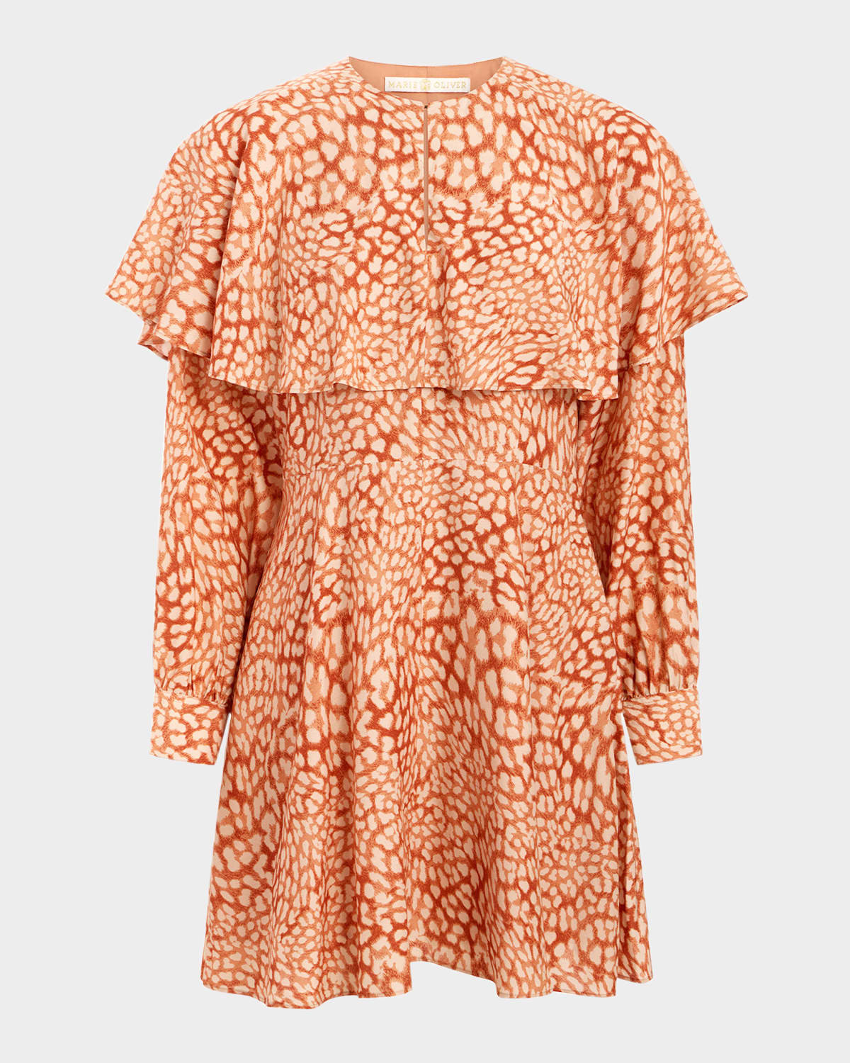 Printed in the Our Desert abstract leopardprint, this Marie Oliver "Reeves" mini dress is airy and fluid with an attached capelet for added femininity Jewel neckline; keyhole button front Long blouson sleeves Button cuffs Hem falls above the knee Aline silhouette Invisible side zipper Rayon/cellulose acetate/silk Imported