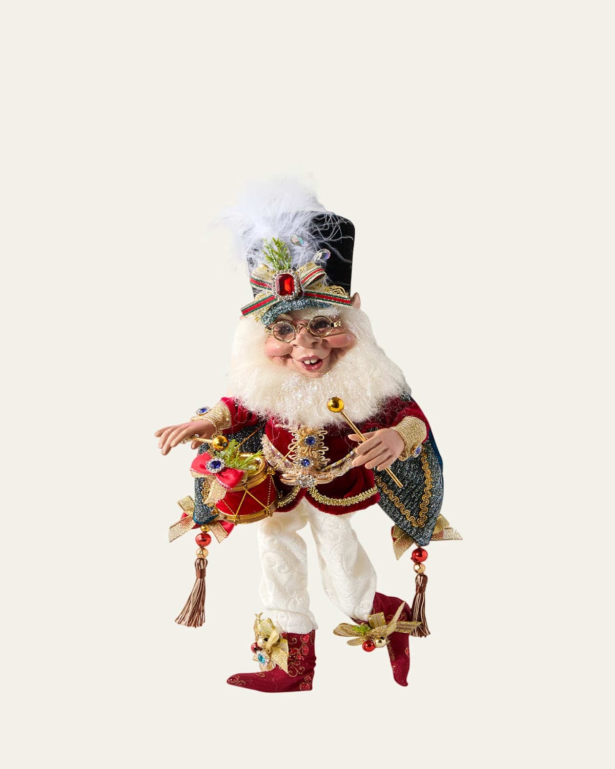 The Drummer Boy Elf marches into your holiday décor dressed in lush textures and trims Handcrafted of polyester, polyresin, wool, and chicken feathers Hair and facial hair made of real sheep's wool Approx. 4"L x 2.8"W x 11"T Item Weight (Lbs.): 0.8 Spot clean Imported