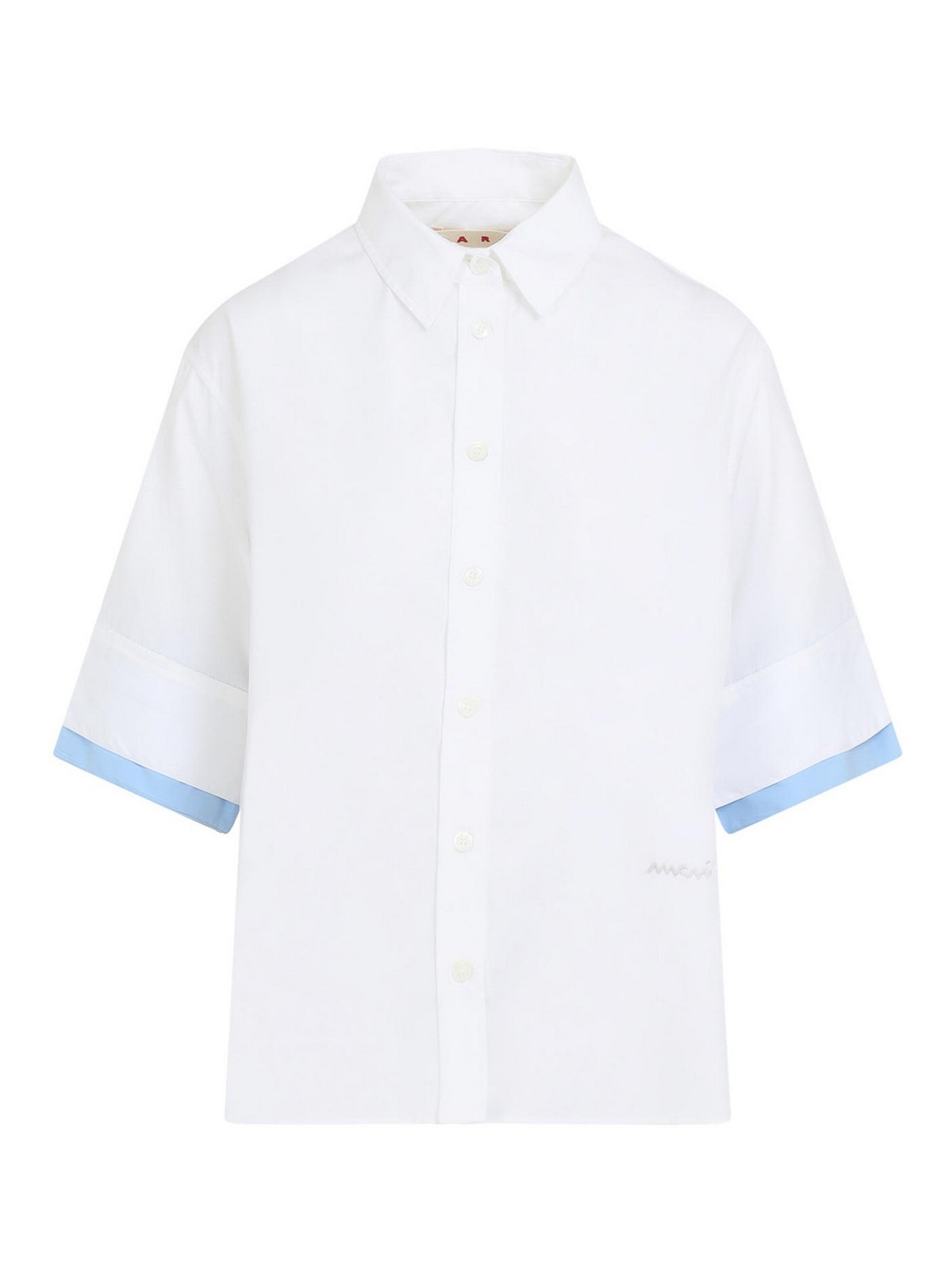 Chemise blanche Marni en popeline blanche à col pointu, manches courtes, manches courtes, double couche, poignets boutonnés, logo brodé sur le dos, empiècement et ourlet droit plissé