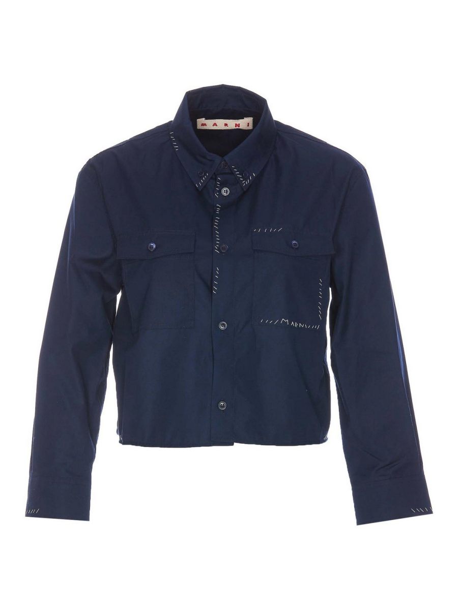 Chemise à logo bleu Marni, boutons à col rond, coutures décoratives, logo frontal sur la poche