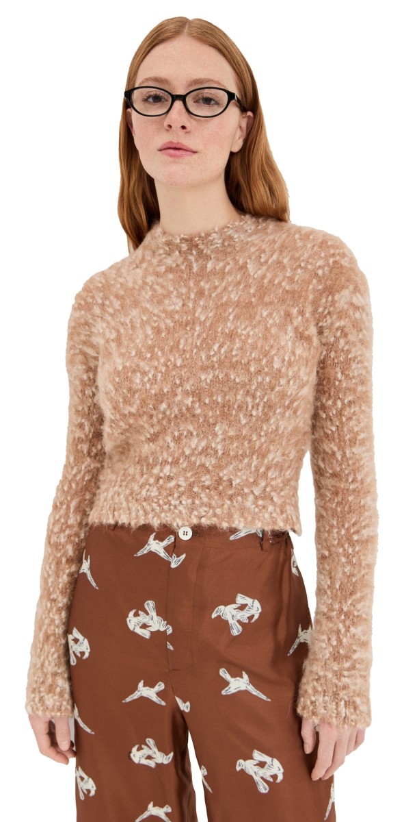Fabric: Lightweight fuzzy knit with stretch. Crew neck. Long sleeves. Shell: 63% alpaca/30% polyamide/7% wool. Dry clean. Imported, Romania. Measurements: Measurements from size 38 Length: 19.75in / 50.0cm, from shoulder