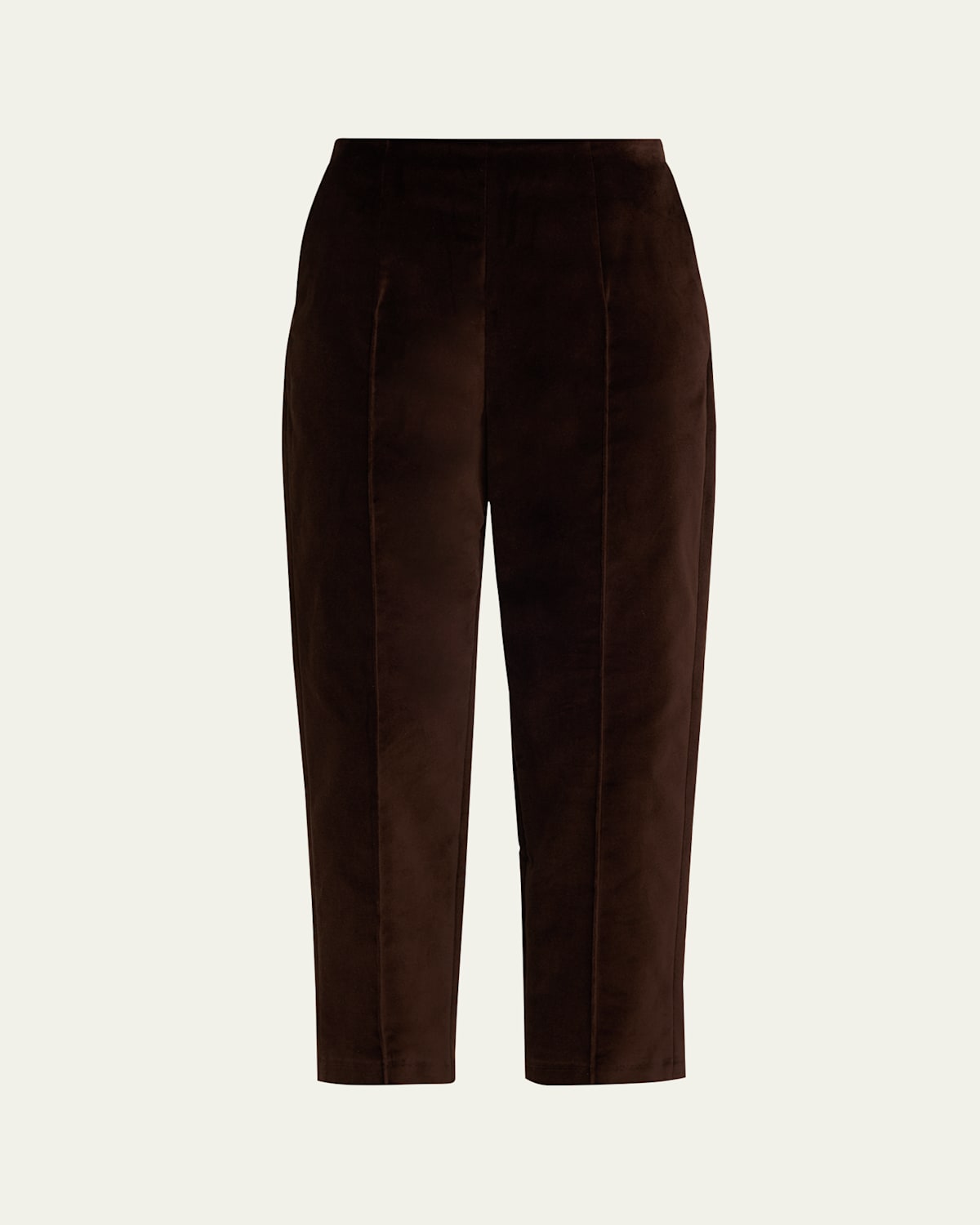 Marni pants are crafted of soft velvet featuring front pintuck seams and pressed back creases Approx. 37.4"L inseam Mid rise sits high on hip Front French pockets Double welt pockets on the back Straight legs Ankle length Invisible side zip Virgin wool Dry clean Made in Italy
