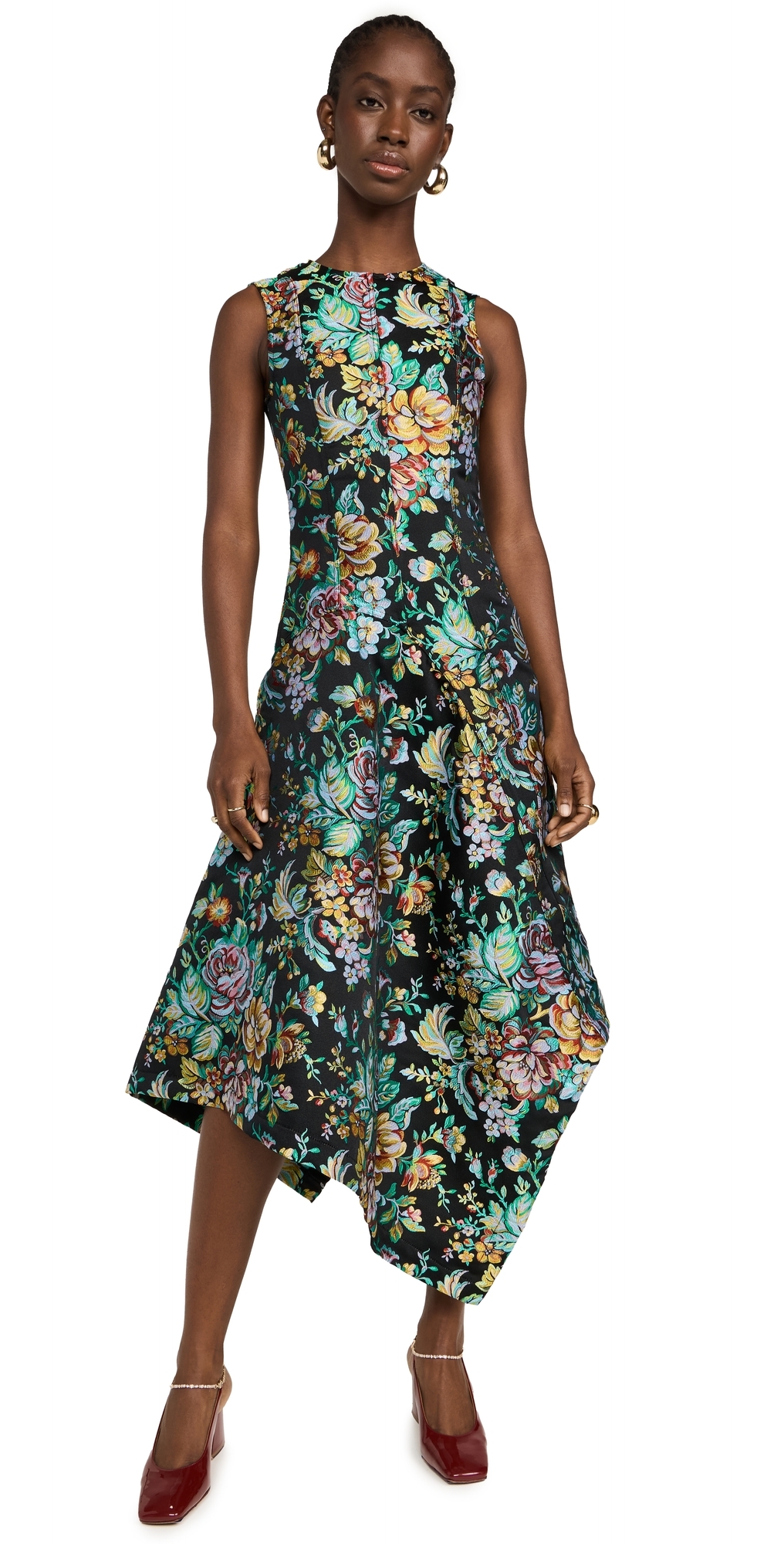 Fabric: Mid-weight, non-stretch brocade weave. Asymmetrical hem. Allover floral pattern. Crew neck. Sleeveless. Patch back pockets. Shell: 67% acetate/33% polyester. Unlined. Dry clean. Made in Portugal. Measurements: Measurements from size S Length: 45in / 114.0cm, from shoulder