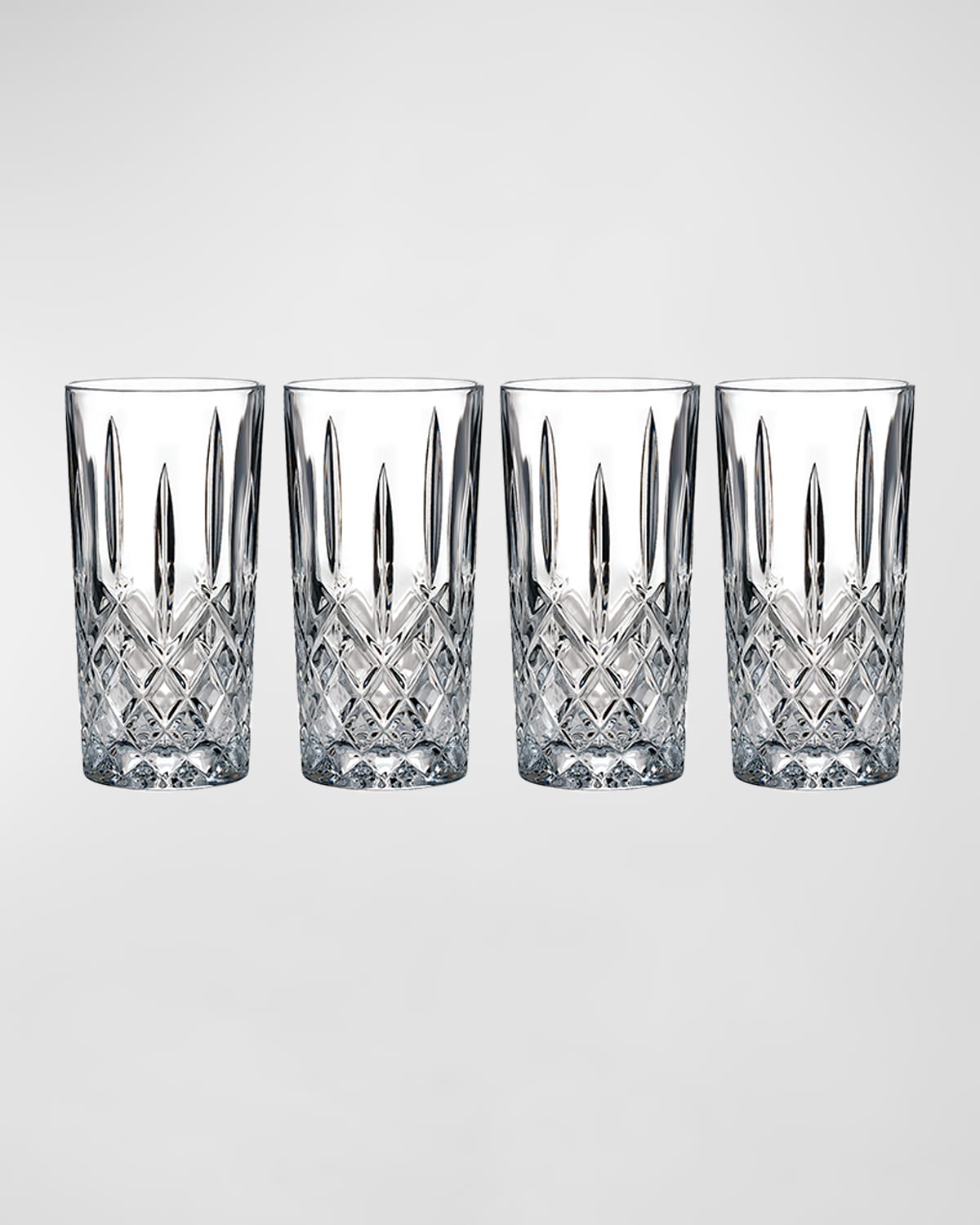 Crystalline highball glasses. Set of four. Each holds 13 ounces. 3"Dia. x 6"T. Hand wash. Made in Italy.