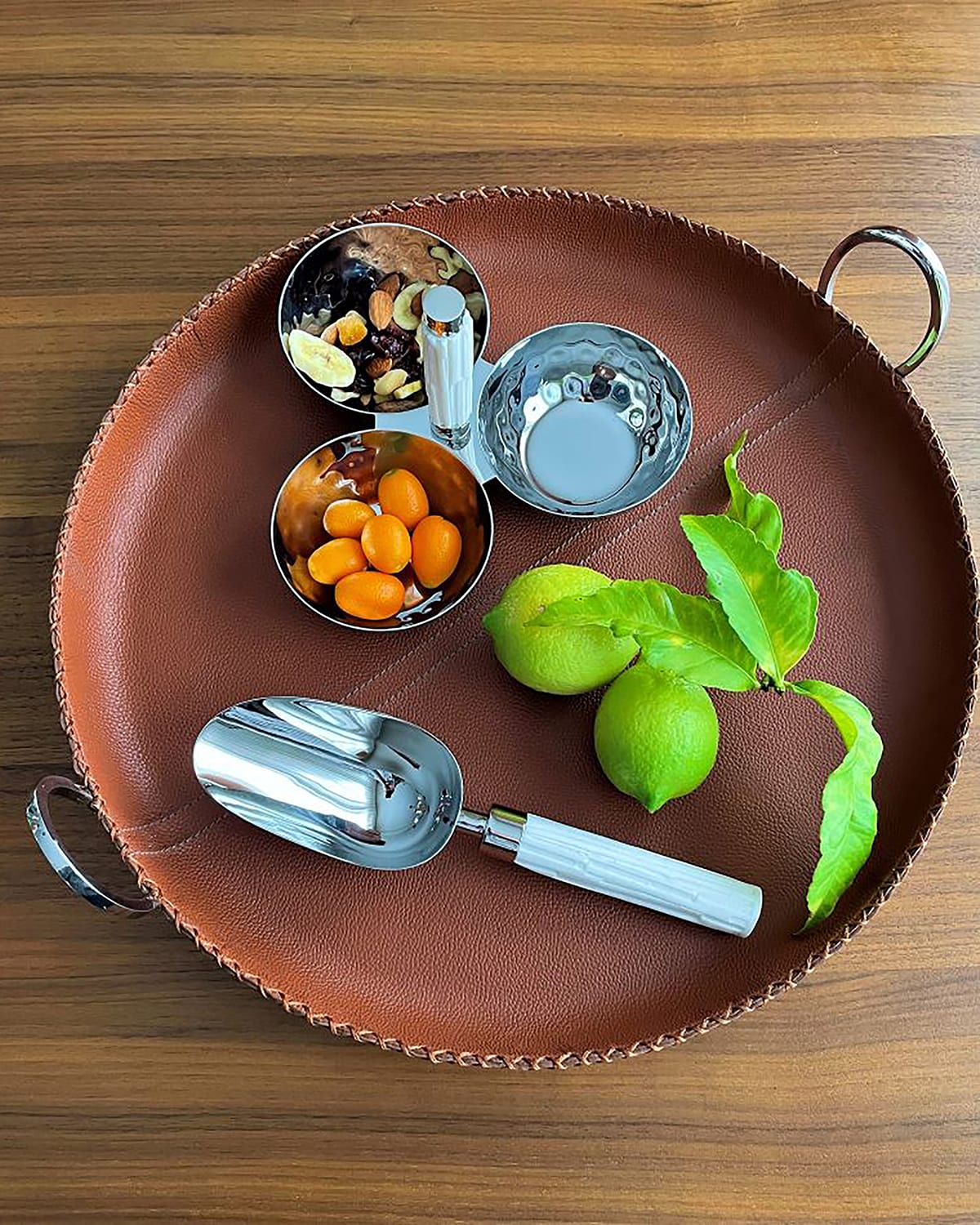 Round tray with ring handles Handcrafted of leather, brass, and nickel Approx. 16"Dia x 4"T Item Weight (Lbs.): 5.0 Hand wash Imported