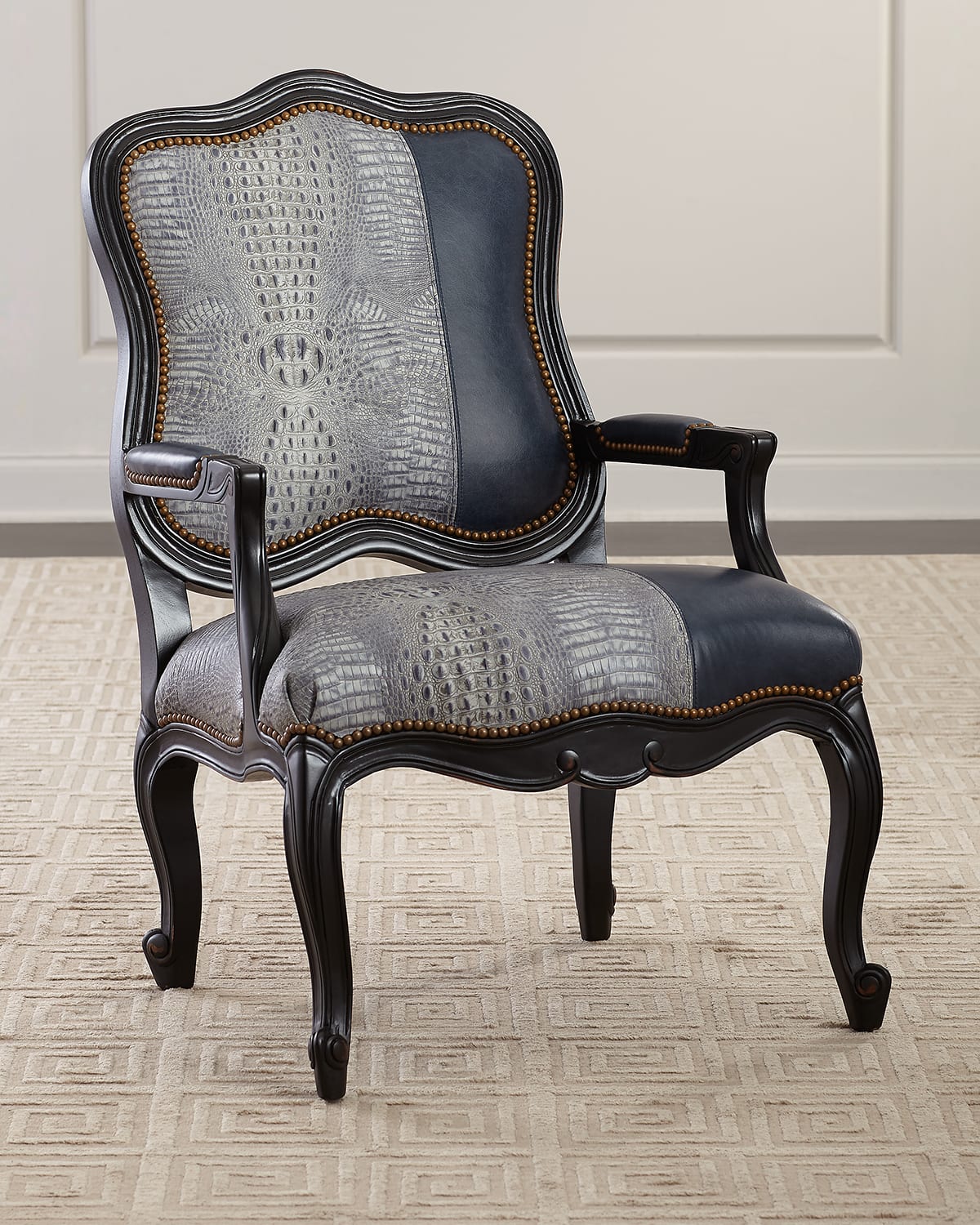 EXCLUSIVELY OURS. Handcrafted chair with nail head trim. Hardwood frame. Leather upholstery. Corner block, glued, and screwed. 27"W x 31"D x 41"T. Arm height, 25". Seat: 20"D x 18"T. Dry clean. Made in the USA of imported materials. Boxed weight, approximately 40 lbs.
