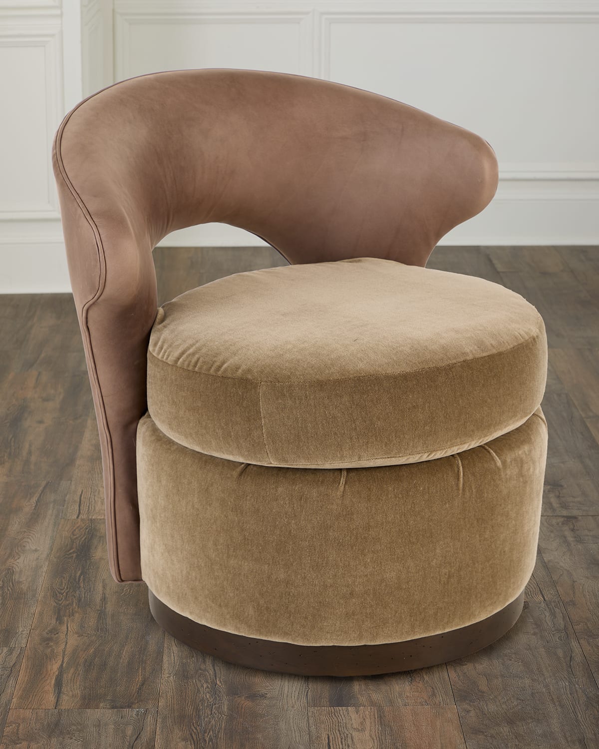 Equipped with a swivel base, the monochromatic Belvedere Chair is a sleek, modern seating arrangement that will add functional style to any living space. Handcrafted of engineered hardwood, leather, and mohair Overall, approx. 32"W x 31"D x 33"T Seat, 22"W x 22"D x 19"T Arm height, 28" Finished back Spot clean Weight, 65.0 lbs Made in USA Boxed weight, approximately 75.0 lbs