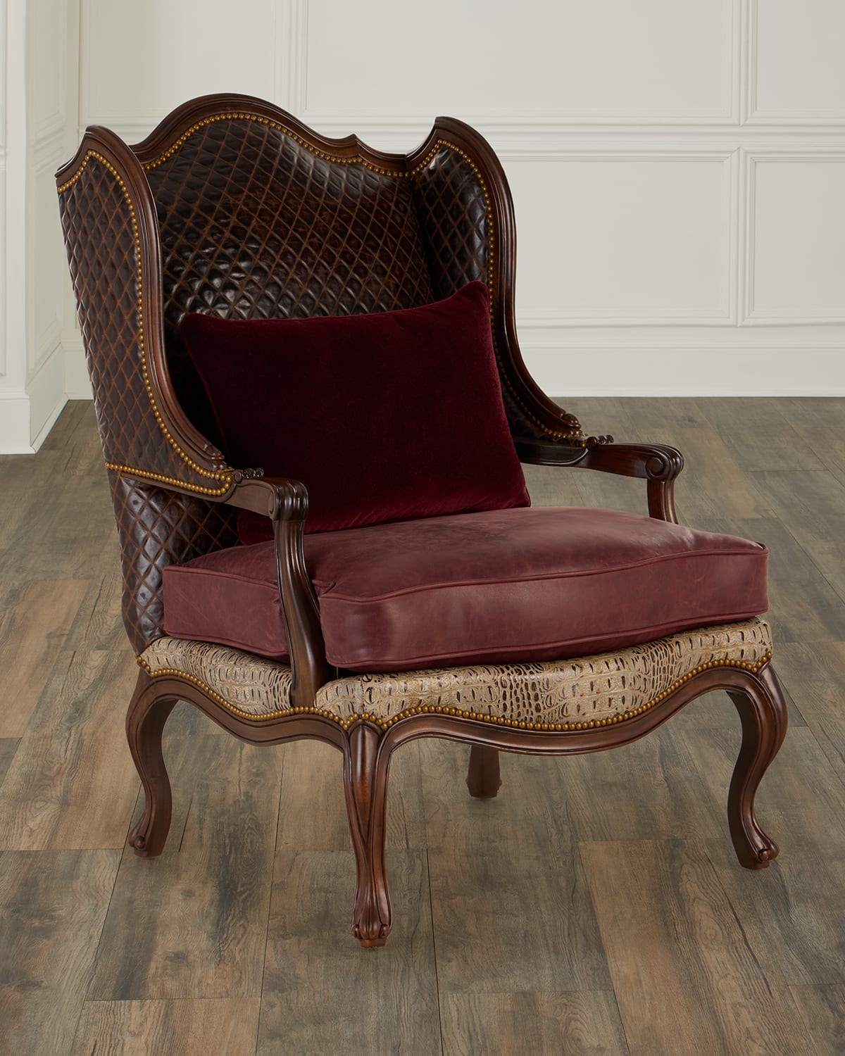 An elegantly shaped wingback chair is given the luxury treatment with diamondstitched leather upholstered along the inner and outer seat back. To accentuate the smooth leather seat cushion, the seat deck is upholstered in alligatorembossed leather with an aged finish. Includes a mohair throw pillow filled with polyester/down for extra comfort and lumbar support Handcrafted of engineered hardwood and leather Carved frame embellished with nailhead trim Overall, approx. 32"W x 38"D x 49"T Seat, 22"W x 24"D x 20"T Arm height, 27" Pillow, 15" x 23" Finished back Wipe clean Weight, 75.0 lbs Made in USA Boxed weight, approximately 80.0 lbs