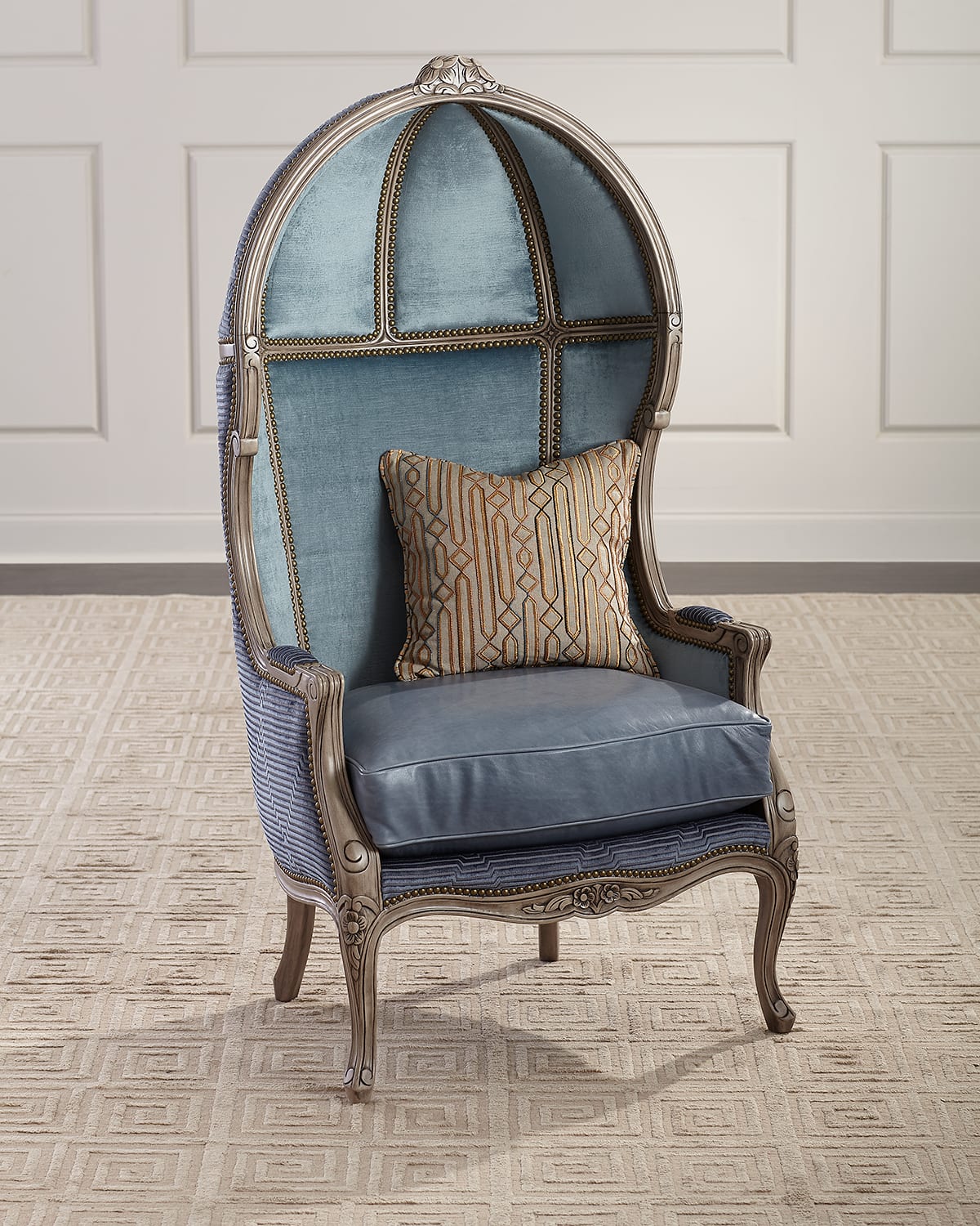 EXCLUSIVELY OURS. Handcrafted chair. Hardwood frame. Leather seat. Other fabrics: polyester; rayon; linen. Includes one pillow (linen). Corner block, glued, and screwed. 29.5"W x 27"D x 58"T. Arm height, 24". Seat: 21"D x 19"T. Dry clean. Made in the USA of Italian materials. Boxed weight, approximately 65 lbs.