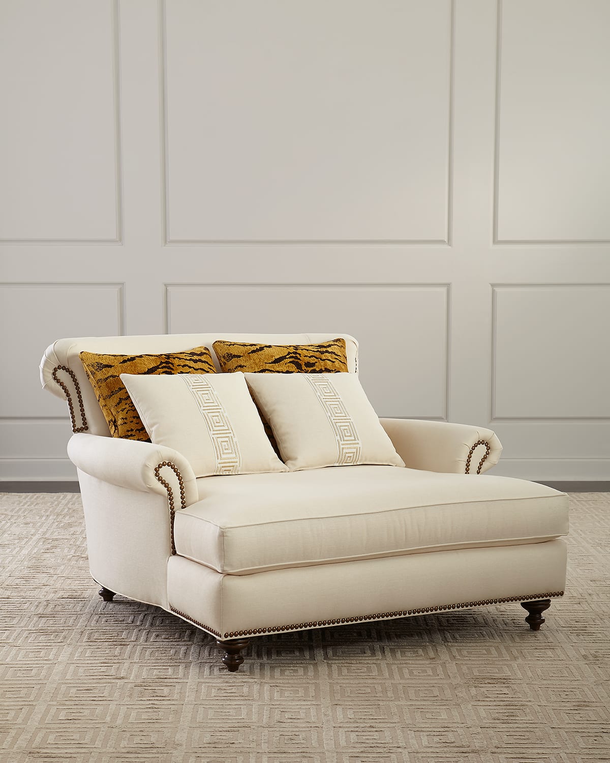 EXCLUSIVELY OURS. Handcrafted chaise with nail head trim. Hardwood frame. Linen upholstery. Includes two 19" pillows and two 22" pillows; viscose/polyester/linen/cotton. Corner block, glued, and screwed. 59"W x 61"D x 38"T. Arm height, 26". Seat: 46"D x 19"T. Dry clean. Made in the USA. Boxed weight, approximately 200 lbs.