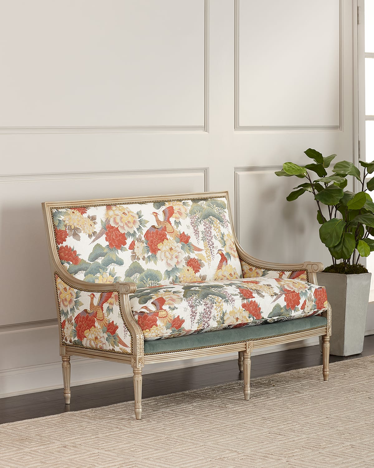 Handcrafted settee with nail head trim. Hardwood frame. Fabric: polyester. Corner blocked, glued and screwed construction. 56"W x 31"D x 39"T. Seat, 48"W x 21"D x 19"T. Arm height, 25". Dry clean. Made in the USA of imported materials. Boxed weight, approximately 100 lbs.