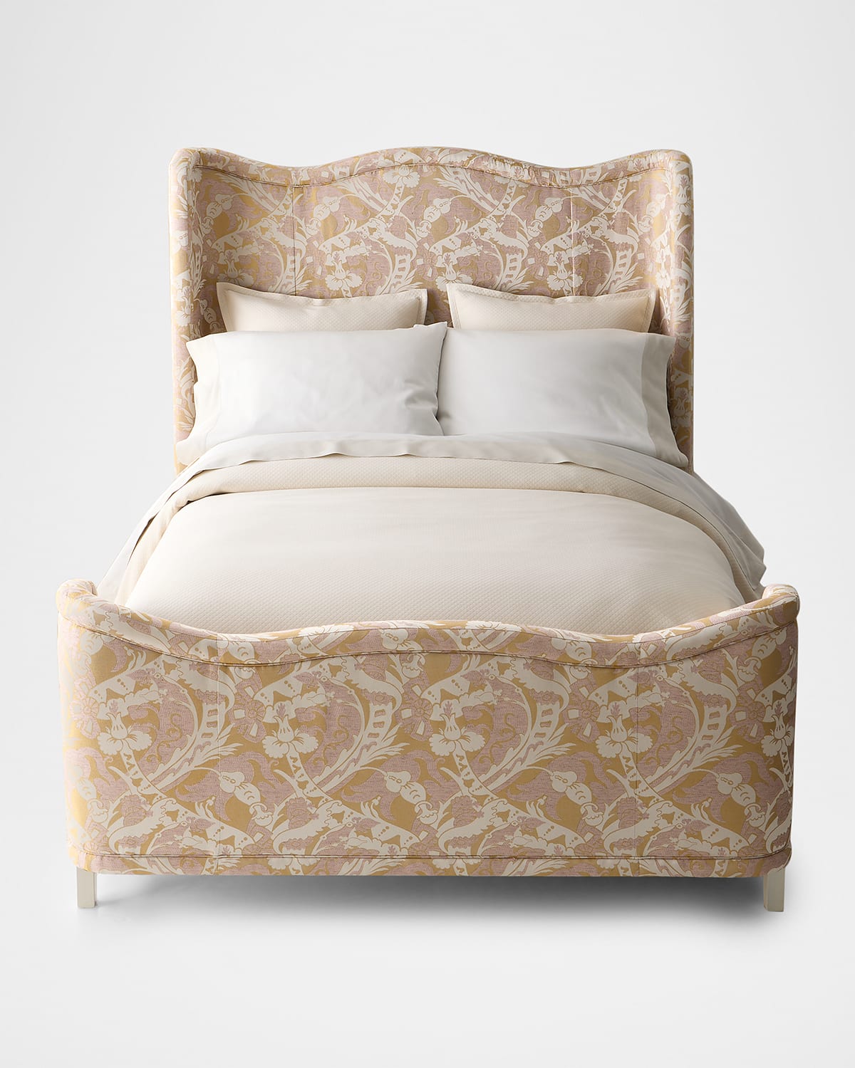 This shelterstyle bed adds a touch of whimsical charm to the bedroom, featuring a curved headboard and footboard accented by beautiful botanical upholstery. Handcrafted of engineered hardwood, polyester, rayon, and flax Overall, approx. 83"W x 89"D x 69"T Assembly required; includes hardware Finished back Weight, 350.0 lbs Made in USA Boxed weight, approximately 360.0 lbs
