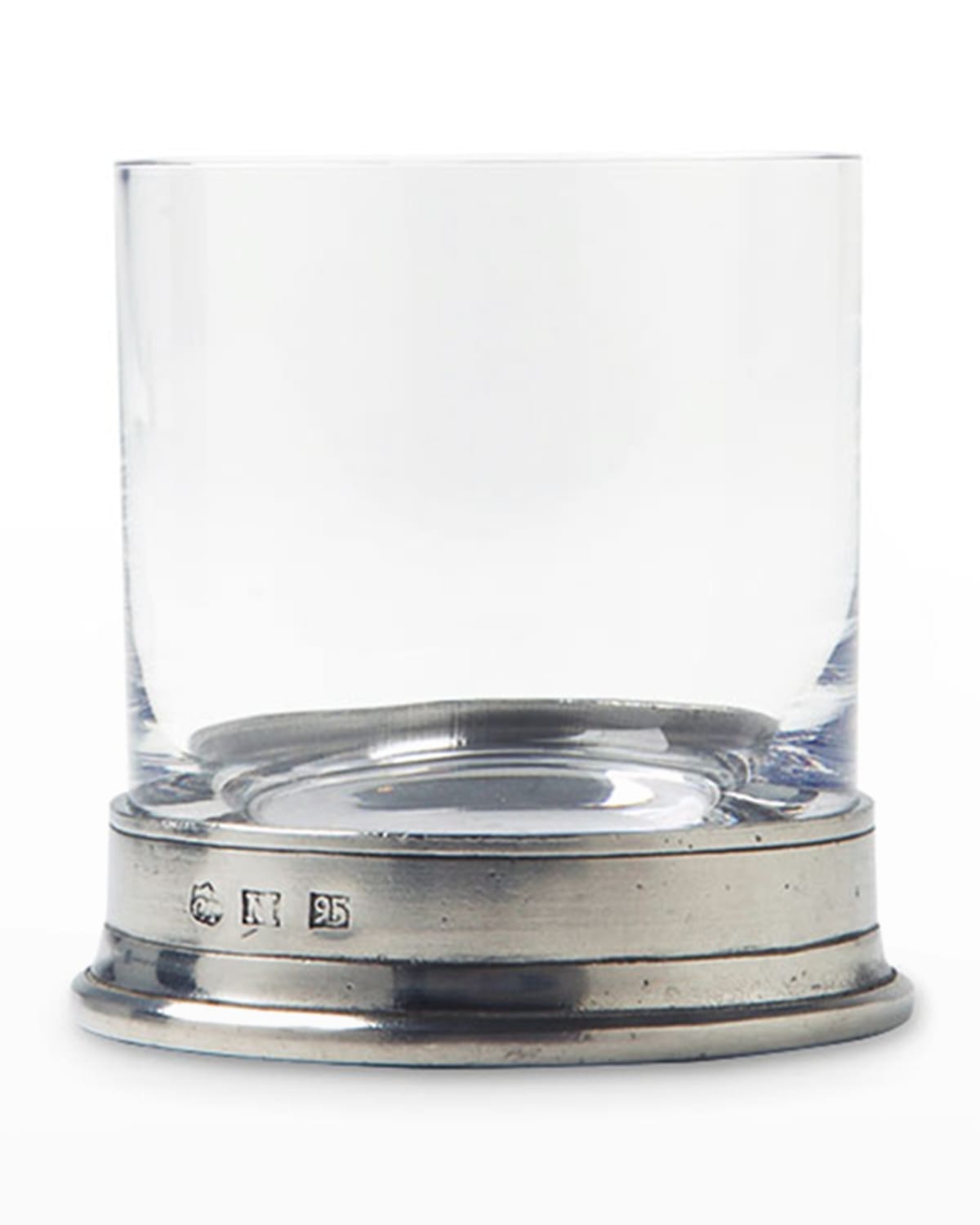 Handcrafted drinking glass. Pewter and leadfree crystal. Overall, 3.5"H. Can hold up to 8 oz. Handmade in Italy.