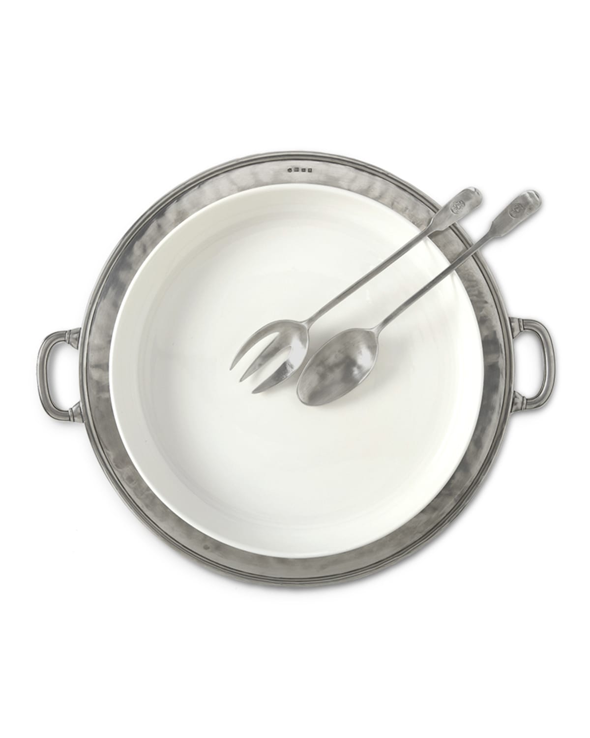 Handcrafted casserole platter with handles. Pewter and ceramic. Handmade in Italy.