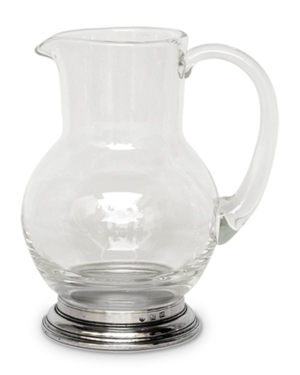 Handcrafted pitcher. Pewter and leadfree crystal. Overall, 5.9"T. Holds 0.5 liters. Handmade in Italy.
