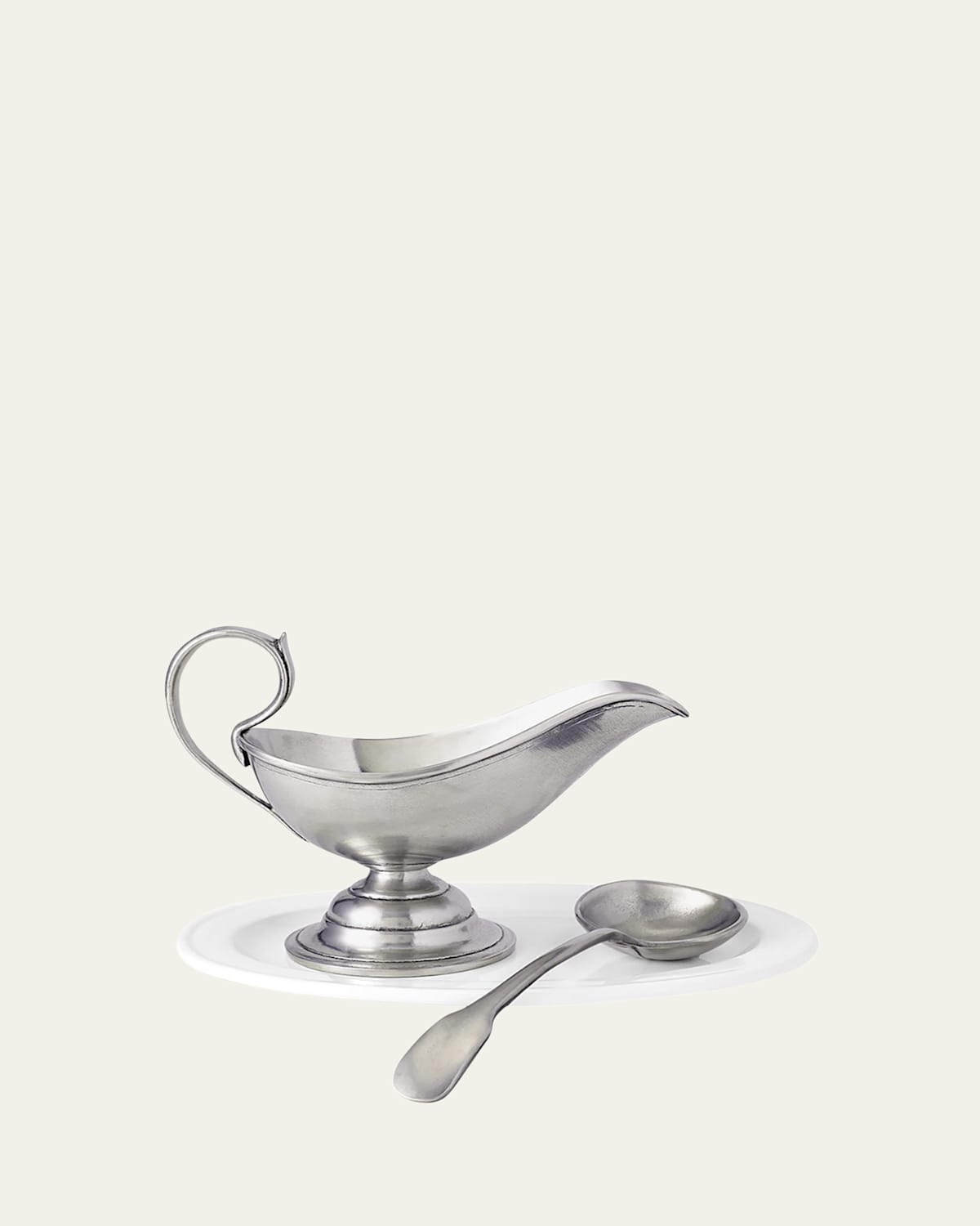 Pewter gravy boat and spoon handmade by artisans in northern Italy. Lead free and safe for everyday use. Gravy boat, 8"W x 4.25"T; holds 8 ounces. Spoon, 7.75"L. Hand wash. Made in Italy.