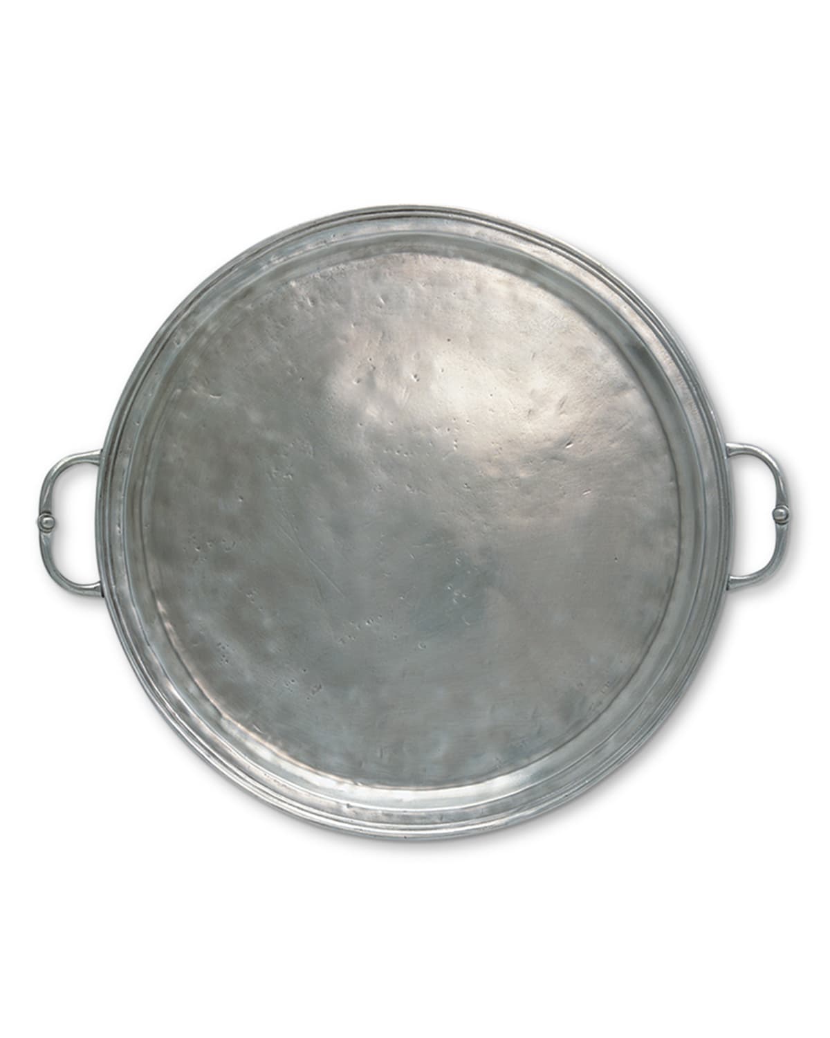 Handcrafted round tray with handles. Pewter. Handmade in Italy.