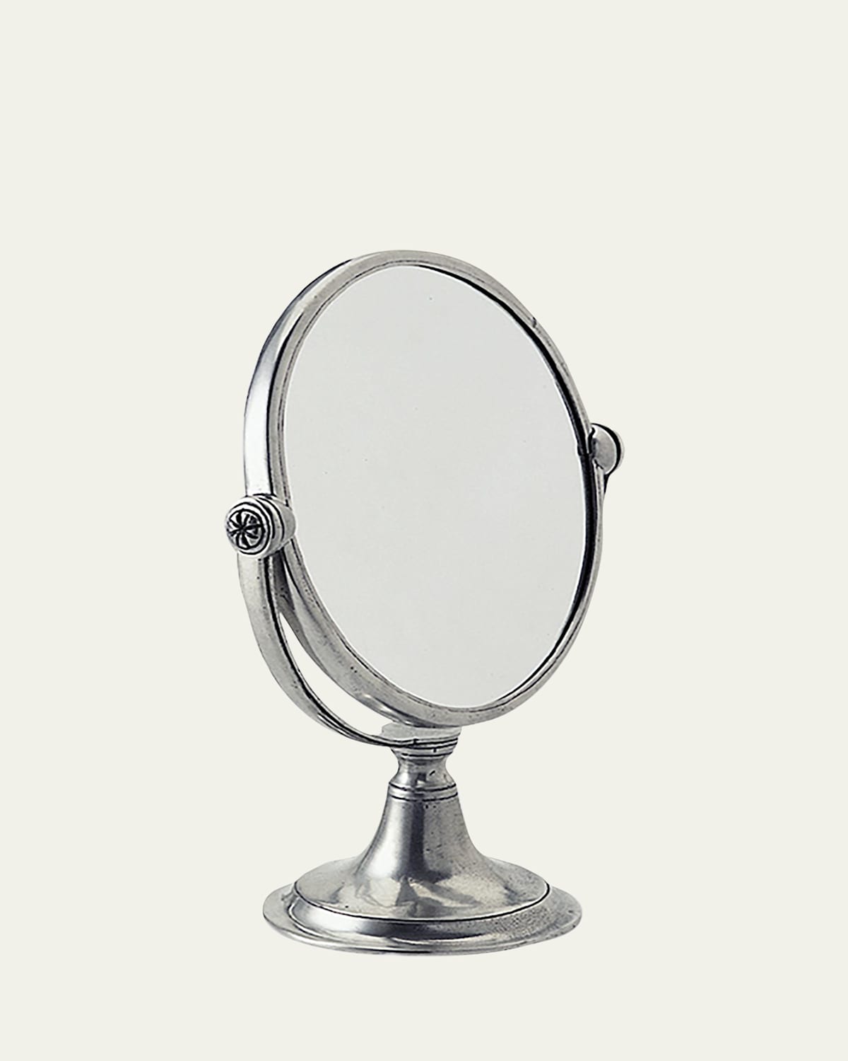 Low vanity mirror with hand cast Italian pewter frame. Approx. 7.9"W x 12.2"T. Made in Italy.