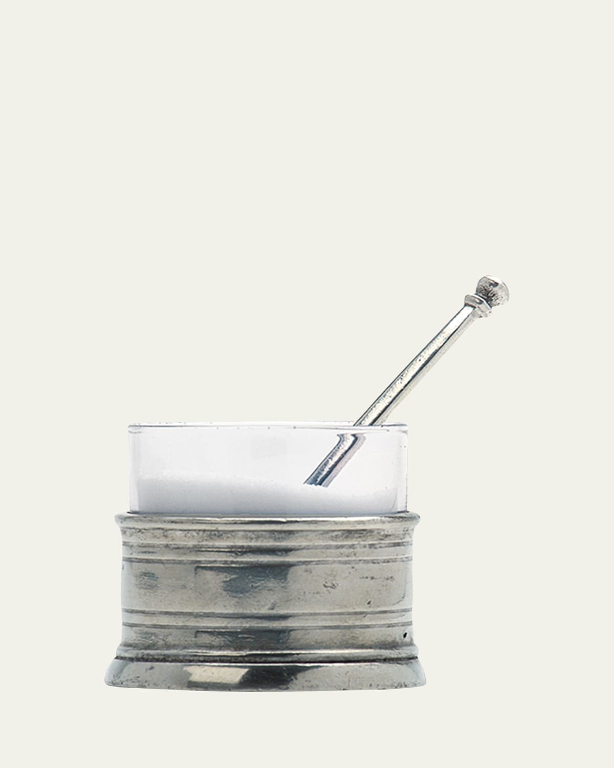 Handcrafted salt cellar with spoon. Pewter and glass. 2.1"Dia x 2"T. Handmade in Italy.