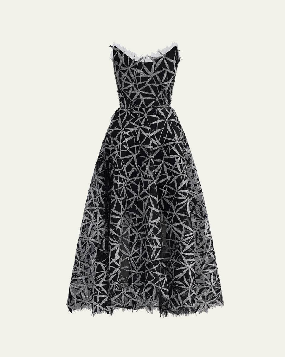 Maticevski "Axis" gown embellished with glittery abstract motif, ribbon appliques, and a raw edge neckline detail Curved strapless neckline Sleeveless Fitandflare silhouette Floor length Back zip Polyester/viscose/nylon/polyamide Dry clean Made in Australia