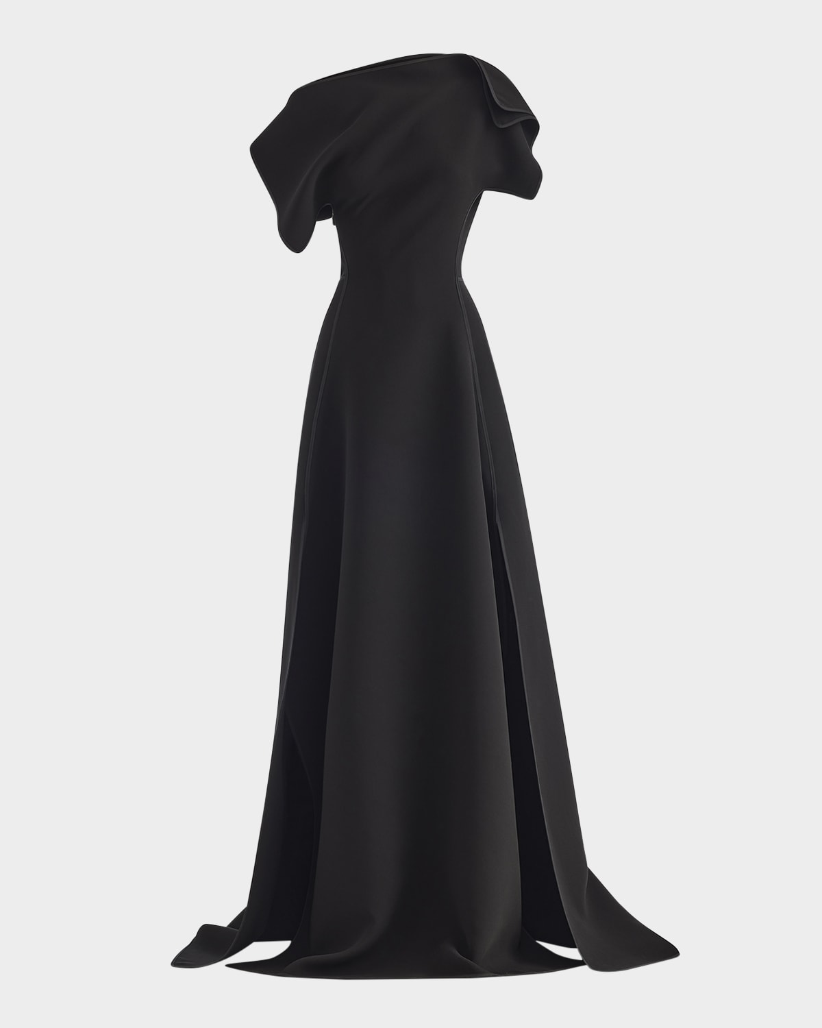 Maticevski "Synergy" gown featuring pieced panels creating draped sleeves and side slits Offtheshoulder neckline Short sleeves Side split pockets Aline silhouette Floor sweeping hem Side zip Polyester Dry clean Made in Australia