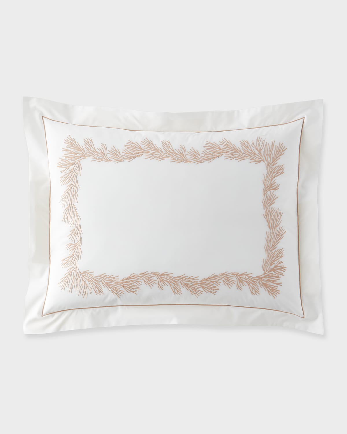 Like the feathery coral found under the Pacific waters, this embroidered pattern gently flows over our crisp percale base. The design is framed by a small, satin stitch border. 520 thread count Ceylon cotton Approx. 21" x 36" Machine wash warm Made in the Philippines