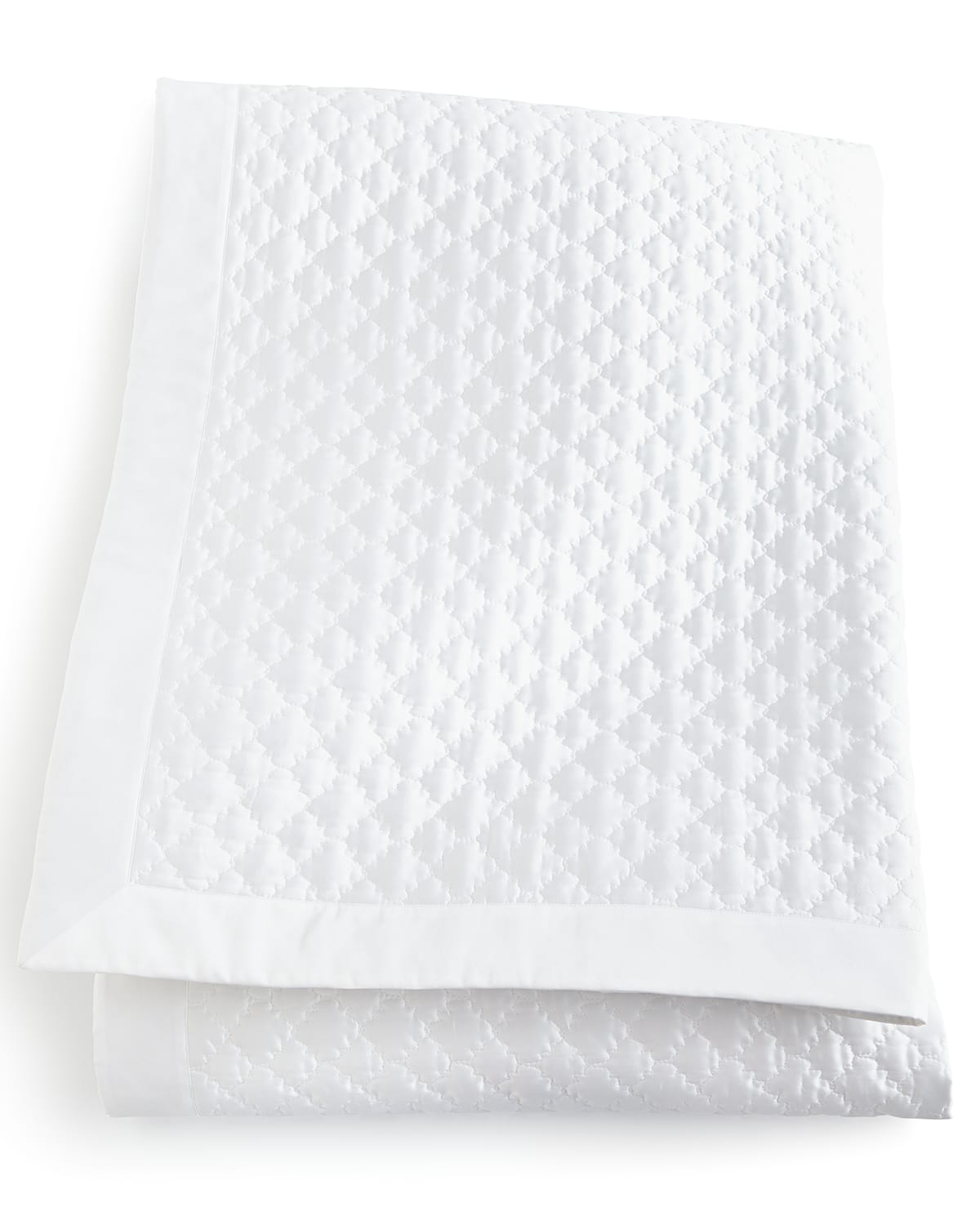 Quilted white coverlet made of 600threadcount Egyptian cotton woven in Italy. 96" x 99". Machine wash. Made in the USA of imported materials.