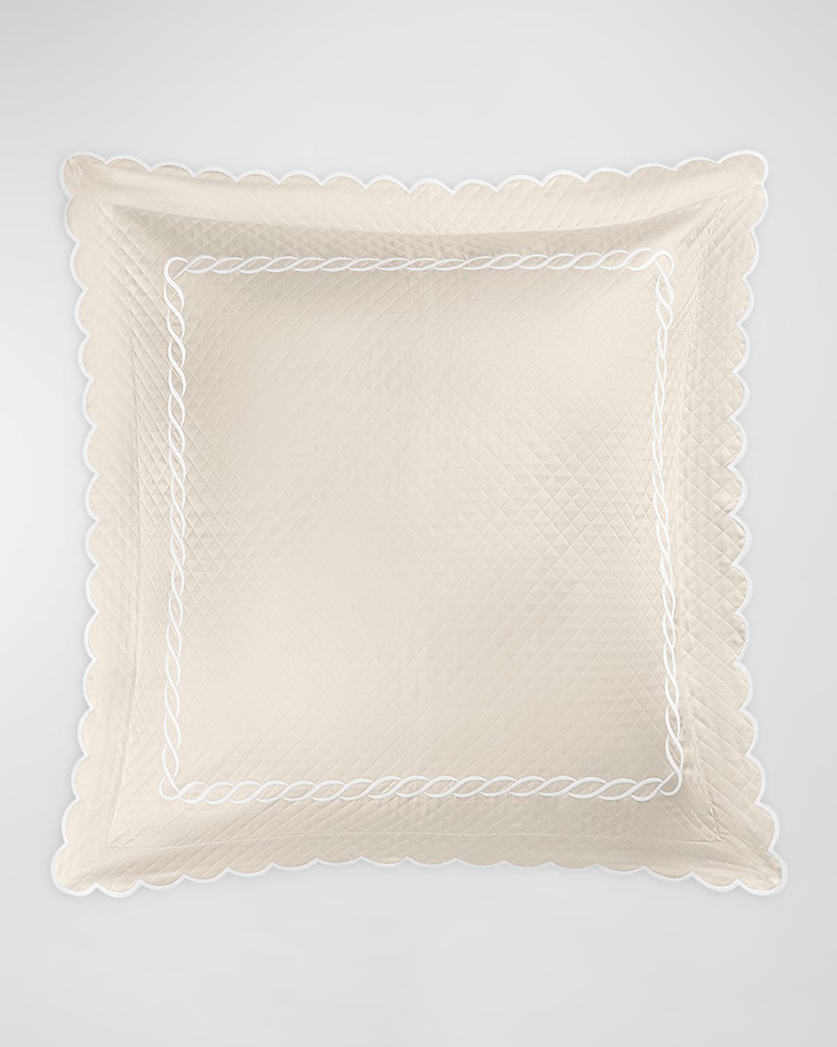 Perhaps the most quintessential of all embroidery motifs, Matouk's Classic Chain with scalloped edge is essential in any wellappointed linen closet. Their newest rendition features these captivating details applied to their sublime Petra diamond matelassé. The combination of embroidery and fabric perfection is built on decades of commitment to relentlessly pursuing ways to make the best even better. Features a 2.5" flange Crafted of cotton Sham have nocturn 600 TC sateen fabric on the reverse in a coordinator color Approx. 27"Sq. Item Weight (Lbs.): 1.7 Machine wash Imported