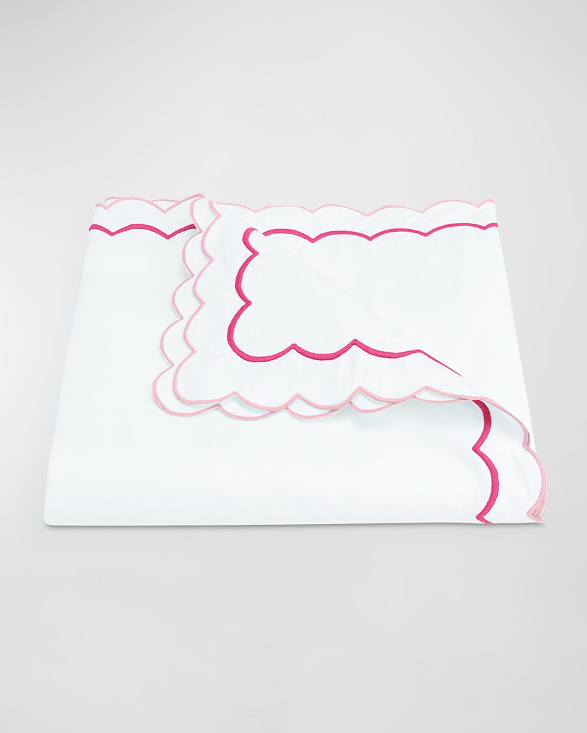 Duvet cover made of 350 thread count longstaple cotton percale. Made with inside corner ties and zipper closure. Approx. 90" x 96", 2" flange Machine wash warm. Do not use bleach or fabric softener. Tumble dry low heat. Iron as needed. Made in the USA of imported materials.